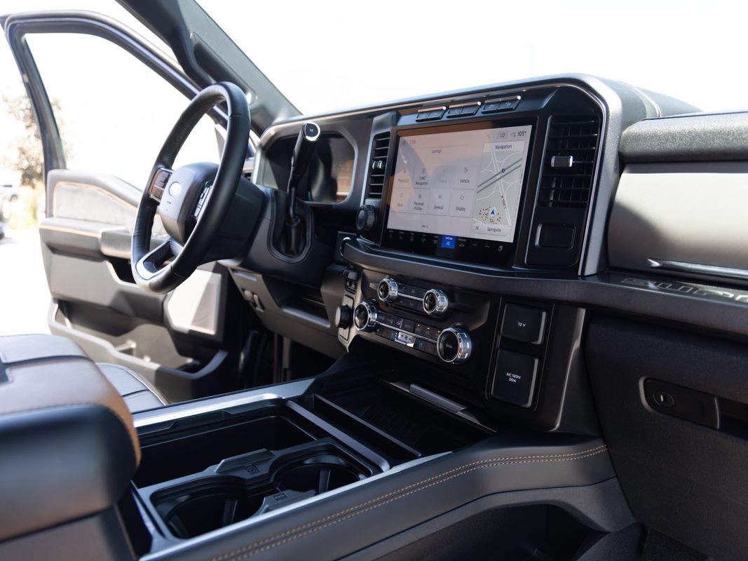 Remote Start,Navigation System,Leather Seats,Heated Seats,Bluetooth,Driver seat: heated massaging, ventilated,Driver seat power adjustments: height lumbar, reclining, 8,Front headrests: adjustable 2,Front seat type: bucket,Passenger seat: heated massaging, ventilated,Passenger seat power adjustments: height lumbar, reclining, 8,Rear headrests: adjustable 3,Rear seat: heated,Rear seat folding: folds up split,Rear seat type: 60-40 split bench,Upholstery: leather-trimmed,ABS: 4-wheel,Braking assist: ,Electronic brakeforce distribution: ,Emergency braking preparation: ,Front brake diameter: 14.29,Front brake type: ventilated disc,Front brake width: 1.5,Power brakes: ,Rear brake diameter: 14.3,Rear brake type: ventilated disc,Rear brake width: 1.5,Alternator: 160 amp and 250 amp (dual),Battery: AGM maintenance-free,Battery rating: 750 CCA,Battery saver: ,Clearance lights: ,Daytime running lights: LED,Exterior entry lights: approach lamps puddle lamps,Front fog lights: LED,Headlights: LED auto delay off, auto high beam dimmer, auto on/off, wiper activated,Taillights: LED,Automatic emergency braking: front front pedestrian, intersection/junction turn, rear,Automatic hazard warning lights: ,Blind spot safety: sensor/alert trailer coverage,Camera system: cargo area surround view, trailer rearview,Child safety door locks: ,Child seat anchors: LATCH system,Cross traffic alert: rear,Crumple zones: front,Driver attention alert system: ,Impact sensor: alert system door unlock, post-collision safety system,Lane deviation sensors: ,Lane keeping assist: ,Parking sensors: rear,Pre-collision warning system: audible warning intersection/junction turn, pedestrian detection, visual warning,Programmable safety key: ,Rearview monitor: in dash,Traffic sign recognition: ,Airbag deactivation: passenger switch,Front airbags: dual,Side airbags: front,Side curtain airbags: front rear,Side mirror adjustments: power power folding, power telescoping,Side mirrors: heated integrated turn signals,Towing mirrors: ,Front wipers: rain sensing variable intermittent,Laminated glass: acoustic windshield,Pickup sliding rear window: power horizontal,Power windows: safety reverse,Rear privacy glass: ,Solar-tinted glass: front,Window defogger: rear,Anti-theft system: alarm anti-tow sensor, interior motion sensor, vehicle immobilizer,Power door locks: anti-lockout auto-locking,Emergency locking retractors: front rear,Front seatbelts: 3-point,Rear seatbelts: 3-point,Seatbelt pretensioners: front,Seatbelt warning sensor: front,4WD selector: electronic hi-lo,4WD type: part time,Axle ratio: 3.73,Front shock type: gas,Front spring type: coil,Front stabilizer bar: diameter 28 mm,Front suspension classification: solid live axle,Front suspension type: multi-link,Rear shock type: gas,Rear spring type: leaf,Rear stabilizer bar: diameter 22 mm,Rear suspension classification: solid live axle,Rear suspension type: multi-leaf,Electronic messaging assistance: voice operated with read function,Hands-free phone call integration: voice operated,Navigation data: real time traffic,Navigation system: touch screen display voice operated,Smart device app compatibility: FordPass Connect,Smart device app function: engine start lock operation, maintenance status, vehicle location,Wi-Fi: hotspot,Wireless data link: Bluetooth,Antenna type: diversity mast,Auxiliary audio input: Bluetooth USB, iPod/iPhone,Digital sound processing: ,Premium brand: Bang & Olufsen,Radio: AM/FM HD radio, touch screen display, voice operated,Radio data system: ,Satellite radio: SiriusXM,Speed sensitive volume control: ,Subwoofer: 1,Total speakers: 13,Watts: 1080,Spare tire mount location: underbody,Spare tire size: full-size,Spare wheel type: steel,Tire Pressure Monitoring System: ,Tire type: all terrain,Wheels: aluminum alloy with painted accents,Clock: ,Compass: ,Customizable instrument cluster: ,Digital odometer: ,External temperature display: ,Fuel economy display: MPG range,Gauge: oil pressure tachometer, transmission temperature,Head-up display: ,Instrument cluster screen size: 12 in.,Multi-function display: ,Powertrain hour meter: ,Trip odometer: ,Warnings and reminders: low fuel level maintenance due,Air filtration: ,Front air conditioning: automatic climate control,Front air conditioning zones: dual,Rear vents: second row,Armrests: rear center with cupholders,Center console trim: leather,Dash trim: alloy,Door sill trim: scuff plate,Door trim: alloy leather,Floor mat material: carpet,Floor material: carpet,Floor mats: front rear,Heated steering wheel: ,Steering wheel trim: leather,Door handle color: body-color with chrome accents,Exhaust tip color: chrome,Front bumper color: body-color,Grille color: aluminum,Mirror color: chrome,Pickup bed light: LED,Rear bumper color: body-color,Running board color: black,Running boards: power retractable,Tailgate: lift assist power locking, power open, removable, step,Window trim: black,Automated trailer backup steering: straight line and turning,Onboard payload weight monitor: ,Pickup bed cargo management: tie-down anchors,Tow hooks: front,Trailer brake controller: ,Trailer hitch: ,Trailer hitch tongue weight monitor: ,Trailer wiring: 4-pin 7-pin,Upfitter switches: ,Adaptive cruise control: ,Adaptive stop and go cruise control: semi-automatic,Adjustable pedals: power,Ambient lighting: color,Assist handle: front rear,Autonomous lane guidance: lane centering,Center console: front console with armrest and storage,Cupholders: front rear,Easy entry: power driver seat power steering wheel,Keypad entry: ,Memorized settings: 3 driver adjustable pedals, driver seat, side mirrors, steering wheel,Multi-function remote: panic alarm proximity entry system,One-touch windows: 2,Overhead console: front,Power outlet(s): 115V cargo area 115V front, 115V rear, 12V front, USB front, USB-C front,Power steering: ,Power windows: lockout button,Push-button start: ,Reading lights: front rear,Rearview mirror: auto-dimming,Remote engine start: ,Steering wheel: power 