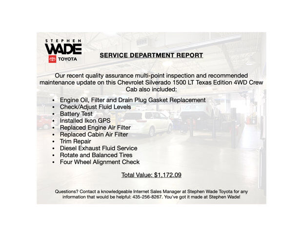 ONE OWNER CLEAN CARFAX. 2022 Chevrolet Silverado 1500 LT Texas Edition 4WD Crew Cab in Dark Ash Metallic with Jet Black Cloth. Duramax 3.0L Turbo-Diesel Engine, 10-Speed Automatic Transmission, 4-Wheel Drive.22/26 City/Highway MPG.CALL STEPHEN WADE TOYOTA: 435-241-3828.Preferred Equipment Group 1LT.Duramax 3.0L Turbo-Diesel Engine.20-Inch Aluminum Wheels w/Grazen Painted Pockets.Z71 Off-Road Package.Convenience Package II.Assist Steps.Front Bucket Seats w/Center Console.Dark Essential Package.All-Weather Floor Liners.Wheel Locks.SERVICE REPORT: At Stephen Wade Toyota, we do more to insure we offer the most mechanically sound pre-owned vehicles with maintenance that is up to date. Our recent quality assurance multi-point inspection and recommended maintenance update on this Chevrolet Silverado 1500 LT Texas Edition also included an engine oil, filter and drain plug gasket replacement, check/adjust fluid levels, battery test, installed Ikon GPS, replaced engine air filter, replaced cabin air filter, trim repair, diesel exhaust fluid service, rotate and balanced tires and a four wheel alignment check - a $1,172.09 value.MARKET REPORT: We use advanced software to shop the automotive marketplace nationwide everyday. This allows us to competitively offer you the best value one can find anywhere. Contact our knowledgeable Internet sales managers; Danny, Jessica or Wesley at Stephen Wade Toyota for a priority test drive, or for any information that would be helpful: 435-241-3828. You've got it made at Stephen Wade!