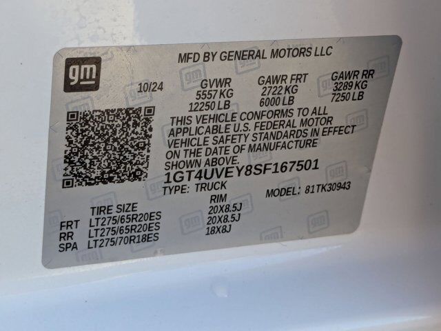 AT4 Preferred Package,AT4 Premium Plus Package,Preferred Equipment Group 4SB,Technology Package,X31 Off-Road Package,7 Speakers,AM/FM radio: SiriusXM with 360L,Bose Premium 7-Speaker Sound System,Radio: AM/FM w/Premium GMC Infotainment System,SiriusXM w/360L Trial Subscription,Steering Wheel Audio Controls,Air Conditioning,Automatic temperature control,Electric Rear-Window Defogger,Front dual zone A/C,Rear window defroster,120-Volt Bed Mounted Power Outlet,120-Volt Instrument Panel Power Outlet,Driver Memory,Memory seat,Power driver seat,Power Front Windows w/Passenger Express Up/Down,Power steering,Power windows,Push Button Start,Remote keyless entry,Remote Vehicle Starter System,Steering wheel mounted audio controls,Universal Home Remote,Manual Tilt-Wheel/Telescoping Steering Column,Off-Road Suspension,Speed-sensing steering,Traction control,4-Wheel Disc Brakes,ABS brakes,Dual front impact airbags,Dual front side impact airbags,Front anti-roll bar,Front wheel independent suspension,Keyless Open & Start,Low tire pressure warning,Occupant sensing airbag,Overhead airbag,Power Sunroof,Pickup Bed,Brake assist,Electronic Stability Control,Lane Departure Warning System,Exterior Parking Camera Rear,Hill Descent Control,Auto High-beam Headlights,Delay-off headlights,Front fog lights,Fully automatic headlights,Panic alarm,Security system,Unauthorized Entry Theft-Deterrent System,Speed control,2-Speed Active Transfer Case,220 Amp Alternator,Engine Block Heater,Exhaust Brake,Heavy-Duty 80 Amp-Hr Battery,Auto-dimming door mirrors,Black Front & Rear Molded Splash Guards (LPO),Bumpers: body-color,Front License Plate Kit,Gloss Black Header & Grille Insert Bars,Heated door mirrors,IntelliBeam Automatic High Beam On/Off,LED Cargo Area Lighting,LED Smoked Amber Roof Marker Lamps,Off-Road High Clearance Step (LPO),Power door mirrors,Rear step bumper,Rear Wheelhouse Liners,Spray-On Pickup Bedliner w/GMC Logo,Turn signal indicator mirrors,Winter Grille Cover,2 Charge-Only Rear USB Ports,2 Charge/Data USB Ports Inside Center Console,2 USB Ports,Auto-Dimming Inside Rearview Mirror w/Camera,Auto-dimming Rear-View mirror,Automatic Emergency Braking,Bed View Camera w/2 Trailer Camera Provisions,Buckle to Drive,Compass,Driver door bin,Driver vanity mirror,Floor-Mounted Center Console,Following Distance Indicator,Forward Collision Alert,Front Pedestrian Braking,Front reading lights,GMC Premium 13.4 inch Diagonal Information Display,HD Surround Vision,Heated steering wheel,Illuminated entry,Multicolor 15 inch Diagonal Head-Up Display,Outside temperature display,Overhead console,Passenger vanity mirror,Prem Front Floor Liners w/Removable Carpet Insert,Prem Rear Floor Liners w/Removable Carpet Insert,Rear Cross Traffic Alert,Rear reading lights,Rear seat center armrest,Safety Alert Seat,Tachometer,Telescoping steering wheel,Tilt steering wheel,Trailer Camera Provisions,Trailer Side Blind Zone Alert,Trip computer,Ultrasonic Front & Rear Park Assist,Voltmeter,Wireless Charging,Wireless Phone Projection,10-Way Power Driver Seat Adjuster w/Lumbar,10-Way Power Passenger Seat Adjuster w/Lumbar,Front Bucket Seats,Front Center Armrest,Heated 2nd Row Outboard Seats,Heated Driver & Front Outboard Passenger Seats,Heated front seats,Heated rear seats,Perforated Front Leather Seat Trim,Power passenger seat,Split folding rear seat,Ventilated Driver & Front Passenger Seats,Ventilated front seats,Cargo Tie-Down Rings (Set of 4) (LPO),Passenger door bin,Hitch Guidance w/Hitch View,Trailer Tire Pressure Monitor Sensors,Alloy wheels,Wheels: 20 inch High Gloss Black 8 Spoke Aluminum,Deep-Tinted Glass,Front Rain-Sensing Wipers,Power Sliding Rear Window w/Defogger,Rain sensing wipers,Variably intermittent wipers,REAR CAMERA MIRROR inside rearview auto-dimming with full camera display,LPO FRONT AND REAR MOLDED SPLASH GUARDS BLACK (dealer-installed),LICENSE PLATE KIT FRONT,TIRES LT275/65R20 ALL-TERRAIN BLACKWALL (STD),AUDIO SYSTEM 13.4 DIAGONAL PREMIUM GMC INFOTAINMENT SYSTEM with Google built in apps such as navigation and voice assistance includes color touch-screen multi-touch display AM/FM stereo Bluetooth streaming audio for music and most phones; featuring wireless Android Auto and Apple CarPlay capability for compatible phones. (STD),TECHNOLOGY PACKAGE includes (DRZ) Rear Camera Mirror and (UV6) Multicolor 15 Diagonal Head-Up Display,TRANSMISSION ALLISON 10-SPEED AUTOMATIC,WHEELS 20 (50.8 CM) HIGH GLOSS BLACK ALUMINUM WHEELS 8 SPOKES,ENGINE DURAMAX 6.6L TURBO-DIESEL V8 B20-DIESEL COMPATIBLE (470 hp [350.5 kW] @ 2800 rpm 975 lb-ft of torque [1322 Nm] @ 1600 rpm) (Includes (K05) engine block heater.),GVWR 12 250 LBS. (5557 KG) WITH SINGLE REAR WHEELS,WINTER GRILLE COVER,TRAILER TIRE PRESSURE MONITOR SENSORS includes set of 4 sensors. Sensor functionality requires (UET) In-vehicle Trailering App to be ordered with the vehicle and installed by the factory. Sensors will be shipped loose with the truck and will need to be installed on trailer by customer. System is capable of monitoring up to 6 wheels. Additional or replacement sensors are available through GM Accessories,WINDOW POWER REAR SLIDING with rear defogger,UNIVERSAL HOME REMOTE,ENGINE BLOCK HEATER,LPO CARGO TIE-DOWN RINGS SET OF 4 (dealer-installed),SUNROOF POWER,SUMMIT WHITE,AT4 PREFERRED EQUIPMENT GROUP includes standard equipment,LAMPS SMOKED AMBER ROOF MARKER (LED),LPO OFF-ROAD HIGH CLEARANCE STEP (dealer-installed),AT4 PREMIUM PLUS PACKAGE includes (PDO) AT4 Preferred Package (CF5) power sunroof (CWM) Technology Package and (VXW) Off-Road High Clearance step LPO,REAR AXLE 3.42 RATIO,EXHAUST BRAKE,AT4 PREFERRED PACKAGE includes (UG1) Universal Home Remote (A48) rear sliding power window and (U01) Roof Marker Lamps,TRAILERING WIRING PROVISIONS for trailering 5th wheel and gooseneck trailer includes additional 7-way wiring harness located at the rear of the pickup bed attached to the rear frame cross member,ALTERNATOR 220 AMPS,SEATS FRONT BUCKET WITH CENTER CONSOLE (STD),MULTIC