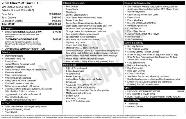 Get ready to hit the road in this Chevrolet Trax, a standout choice for drivers looking for reliability, performance, and style! This impressive vehicle is packed with premium features designed to make every drive more enjoyable. Plus, you’ll enjoy a $1,000 finance savings, already included in the sale price, when you finance through one of our trusted lending partners. Whether you’re searching for used cars in Salt Lake City, a dependable SUV, or a powerful truck, this Chevrolet Trax delivers everything you need and more. Visit Salt Lake Valley Chrysler Dodge Jeep Ram today to test drive or explore our entire selection of quality pre-owned vehicles. Don’t wait - shop online at www.slvcdjr.com or call 801-484-8755 to learn more! This amazing vehicle comes loaded with options like Driver Confidence Package (Rear Cross-Traffic Alert, Rear Park Assist w/Sensor Indicator, and Side Blind Zone Alert), LT Convenience Package (2 Spare Keys Key System, 3-Spoke Leather-Wrapped Steering Wheel, 6-Way Power Driver Seat Adjuster, Deluxe Cloth/Leatherette Seat Trim, Keyless Open, and Keyless Start), Preferred Equipment Group 1LT (All-Wheel Drive Chassis), 16'' Aluminum Wheels, 2 USB Ports w/Auxiliary Input Jack, 2-Way Manual Front Passenger Seat Adjuster, 3.53 Final Drive Axle Ratio, 4-Way Manual Driver Seat Adjuster, 4-Wheel Disc Brakes, 6 Speakers, 6-Speaker Audio System Feature, ABS brakes, Air Conditioning, Alloy wheels, AM/FM radio: SiriusXM, Apple CarPlay/Android Auto, Body-Color Door Handles, Body-Color Door Handles w/Chrome Accent, Brake assist, Bumpers: body-color, Compass, Delay-off headlights, Deluxe Cloth Seat Trim, Driver door bin, Driver vanity mirror, Driver's Seat Mounted Armrest, Dual front impact airbags, Dual front side impact airbags, Electronic Stability Control, Emergency communication system: OnStar and Chevrolet connected services capable, Exterior Parking Camera Rear, Front anti-roll bar, Front Bucket Seats, Front Bucket Seats w/Driver Power Lumbar, Front License Plate Bracket, Front reading lights, Front wheel independent suspension, Fully automatic headlights, Heated door mirrors, Illuminated entry, Knee airbag, Low tire pressure warning, Occupant sensing airbag, Outside temperature display, Overhead airbag, Panic alarm, Passenger door bin, Passenger vanity mirror, Power door mirrors, Power steering, Power windows, Premium audio system: Chevrolet MyLink, Radio data system, Radio: Chevrolet Infotainment 3 System, Rear seat center armrest, Rear side impact airbag, Rear window defroster, Rear window wiper, Remote keyless entry, Roof rack: rails only, Security system, SiriusXM Radio, Speed control, Split folding rear seat, Spoiler, Steering wheel mounted audio controls, Tachometer, Telescoping steering wheel, Tilt steering wheel, Traction control, Trip computer, and Variably intermittent wipers, making it the perfect choice for your next adventure.