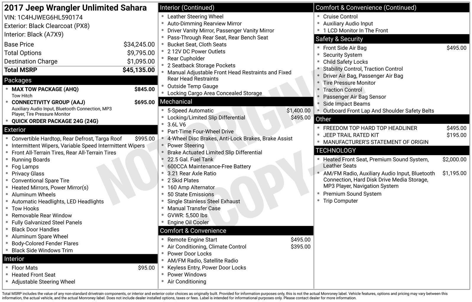Recent Arrival! Bold and ready for fun, our No Accidents Reported 2017 Jeep Wrangler Sahara 4WD with the Premium Sound and Leather Package is proudly displayed in Black Clear Coat! Powered by a 3.6 Liter Pentastar V6 generating 285hp connected to the 5 Speed Automatic transmission. This Four Wheel Drive SUV will impress you as it attains nearly 21mpg on the highway. Our trail-rated tough Jeep offers legendary traction, ground clearance, and maneuverability that make your most adventurous dreams come true! Our Wrangler embodies confident capability, elevates your style, and boasts rugged good looks with LED headlights/fog lights, Class II hitch, a 3-Piece Hard Top, and alloy wheels.
