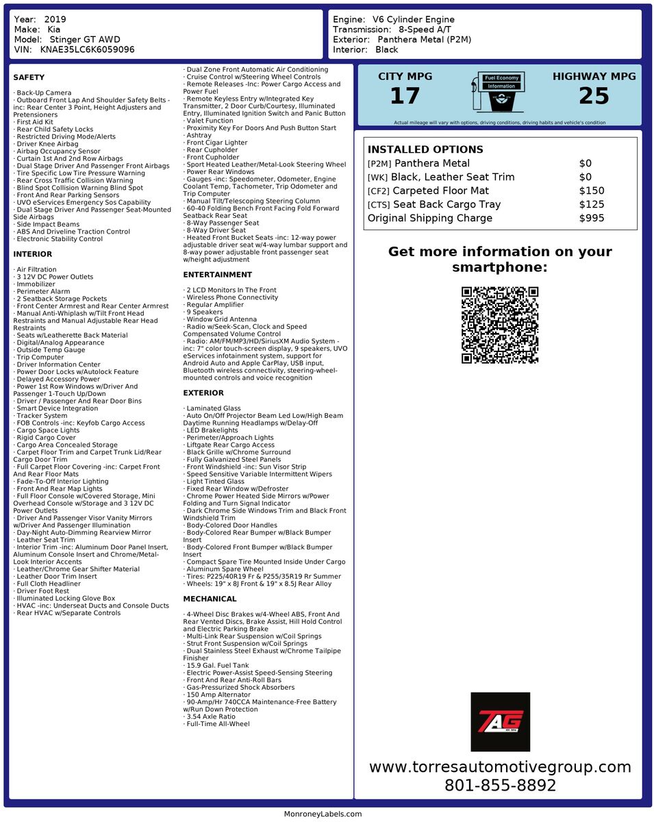 The 2019 Kia Stinger GT AWD is a striking blend of performance and sophistication- featuring a sleek Panthera Metal exterior that exudes a sense of modern elegance. This dynamic sports sedan is powered by a robust 3.3L 6-cylinder engine- offering an exhilarating driving experience with its impressive horsepower and torque. Coupled with its all-wheel drive system- the Stinger GT ensures superior handling and stability- making it a worthy contender in the performance vehicle segment.
