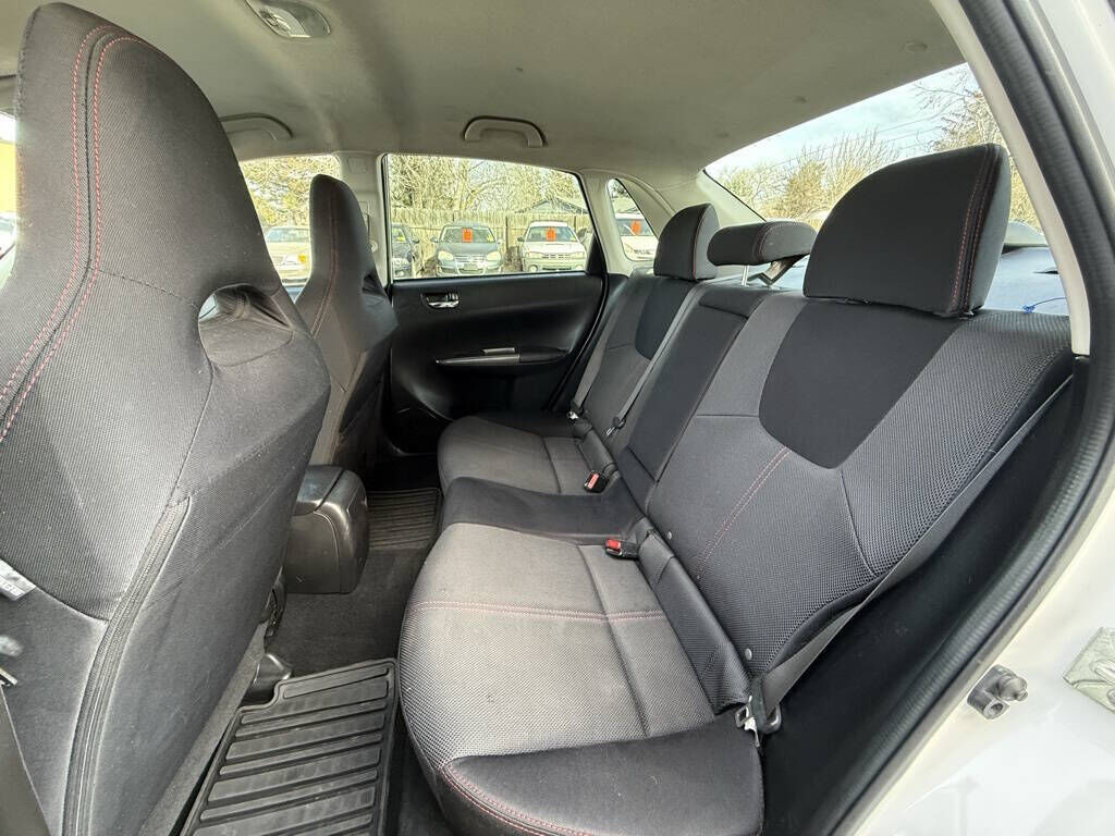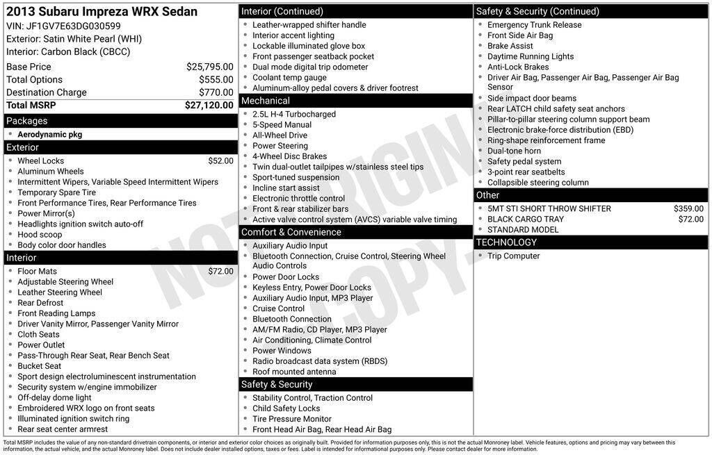 Satin White Pearl 2013 Subaru Impreza WRX AWD 5-Speed Manual 2.5L DOHC Intercooled Turbocharged 17'' Alloy Wheels, 4-Wheel Disc Brakes, 6 Speakers, ABS brakes, Air Conditioning, All Weather Floor Mats, Alloy Wheel Locks, Alloy wheels, AM/FM radio, AM/FM Stereo w/Single-Disc CD Player, Automatic temperature control, Black Cargo Tray, Brake assist, Bumpers: body-color, CD player, Checkered Cloth Upholstery w/Red Stitching, Driver door bin, Driver vanity mirror, Dual front impact airbags, Dual front side impact airbags, Electronic Stability Control, Four wheel independent suspension, Front anti-roll bar, Front Bucket Seats, Front Center Armrest, Front reading lights, Illuminated entry, Leather Shift Knob, Low tire pressure warning, Occupant sensing airbag, Outside temperature display, Overhead airbag, Panic alarm, Passenger door bin, Passenger vanity mirror, Performance Design Front Bucket Seats, Power door mirrors, Power steering, Power windows, Radio data system, Rear anti-roll bar, Rear seat center armrest, Rear window defroster, Remote keyless entry, Security system, Speed control, Speed-sensing steering, Split folding rear seat, Spoiler, Standard Model, Steering wheel mounted audio controls, STI Short Throw Shifter 5MT, Tachometer, Telescoping steering wheel, Tilt steering wheel, Traction control, Trip computer, Variably intermittent wipers.