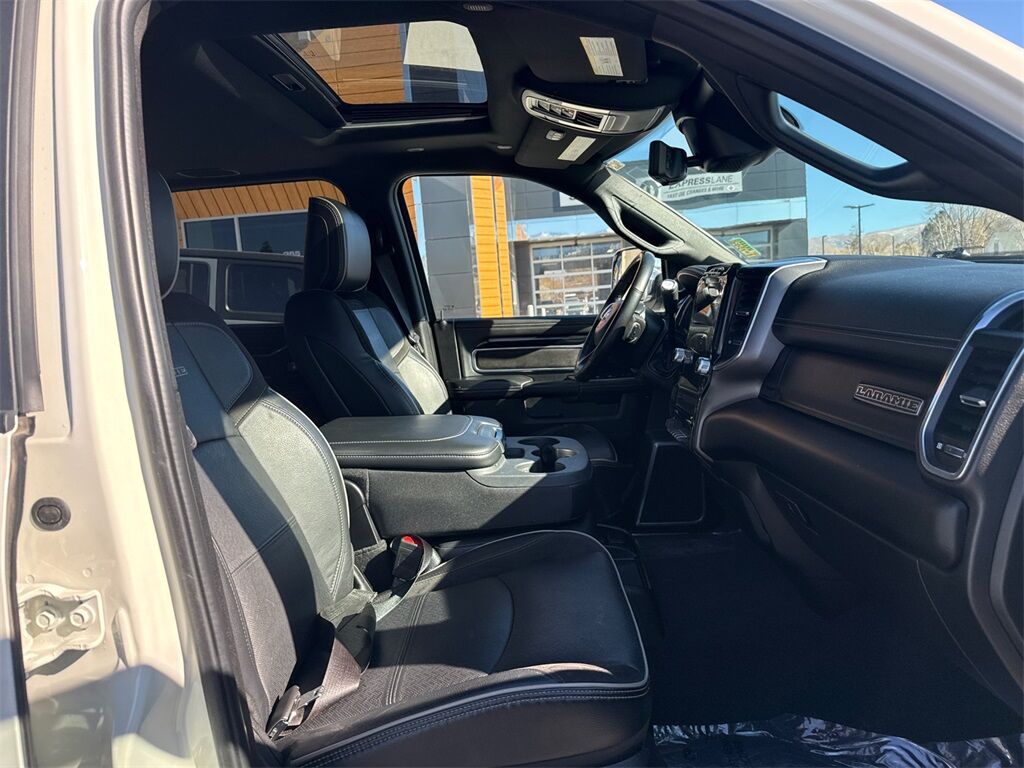#1 Seat Foam Cushion, 10 Speakers, 115V Auxiliary Rear Power Outlet, 12'' Touchscreen Display, 17 Speaker harman kardon Premium Sound, 2 Way Rear Headrest Seat, 220 Amp Alternator, 3.73 Axle Ratio, 4 Way Front Headrests, 4-Wheel Disc Brakes, 4G LTE Wi-Fi Hot Spot, 5th Wheel/Gooseneck Towing Prep Group, 8.4'' Touchscreen Display, ABS brakes, Active Noise Control System, Adaptive Cruise Control w/Stop, Adaptive Steering System, Adjustable pedals, Air Conditioning, Alexa Built-In, All R1 High Radios, All Radio Equipped Vehicles, Alloy wheels, AM/FM radio: SiriusXM, Anti-Spin Differential Rear Axle, Apple CarPlay, Apple CarPlay/Android Auto, Auto High Beam Headlamp Control, Auto-dimming Rear-View mirror, Automatic temperature control, Bed Utility Group, Black Exterior Mirrors, Black Interior Accents, Blind Spot & Cross Path Detection, Body Color Door Handles, Body Color Grille Surround, Brake assist, Bumpers: chrome, Center Hub, Center Stop Lamp w/Cargo View Camera, Chrome Exterior Mirrors, Compass, Connected Travel & Traffic Services, Connectivity - US/Canada, Delay-off headlights, Digital Rearview Mirror, Disassociated Touchscreen Display, Driver door bin, Driver vanity mirror, Dual front impact airbags, Dual front side impact airbags, Electronic Stability Control, Electronically Controlled Throttle, Exterior Mirrors Courtesy Lamps, Exterior Mirrors w/Heating Element, Exterior Mirrors w/Memory, Exterior Mirrors w/Supplemental Signals, Foam Bottle Insert (Door Trim Panel), For Details, Visit DriveUconnect.com, For More Info, Call 800-643-2112, Front anti-roll bar, Front Center Armrest w/Storage, Front dual zone A/C, Front fog lights, Front License Plate Bracket, Front Performance Tuned Shock Absorbers, Front reading lights, Front Seat Back Map Pockets, Full Speed Forward Collision Warning Plus, Fully automatic headlights, Garage door transmitter, Global Telematics Box Module (TBM), Google Android Auto, GPS Antenna Input, GPS Navigation, HD Radio, Heated door mirrors, Heated Front Seats, Heated front seats, Heated Second Row Seats, Heated Steering Wheel, Heated steering wheel, High Back Seats, Hill Descent Control, Illuminated entry, Integrated Center Stack Radio, Integrated Voice Command w/Bluetooth, Lane Keep Assist, Laramie Level B Equipment Group (DISC), Leather steering wheel, Leather Trim 40/20/40 Bench Seat, LED Bed Lighting, Low tire pressure warning, Manufacturer's Statement of Origin, Mirror Running Lights, Mirror-Mounted Aux Reverse Lamps, MOPAR Deployable Bed Step, MOPAR Spray In Bedliner, Occupant sensing airbag, Off Road Decal, Off Road Package, Off-Road Information Pages, Outside temperature display, Overhead airbag, Overhead console, Painted Front Bumper, Painted Rear Bumper, Panic alarm, ParkView Rear Back-Up Camera, Passenger door bin, Passenger vanity mirror, Power 2-Way Driver Lumbar Adjust, Power 2-Way Passenger Lumbar Adjust, Power Adjust 8-Way Driver Seat, Power Adjust 8-Way Front Passenger Seat, Power Adjustable Convex Aux Mirrors, Power Adjustable Pedals w/Memory, Power Deployable Running Boards, Power door mirrors, Power driver seat, Power passenger seat, Power steering, Power Sunroof, Power windows, Power-Folding Mirrors, Pwr Convenience Chrome Tow Mirrors w/Spotter & Memory, Quick Order Package 2HH Laramie, Radio data system, Radio: Uconnect 5 Nav w/12.0'' Display, Radio: Uconnect 5 Nav w/8.4'' Display, Radio: Uconnect 5 w/8.4'' Display, Radio/Driver Seat/Mirrors/Pedals Memory, Rain Sensitive Windshield Wipers, Rear 60/40 Folding Seat, Rear anti-roll bar, Rear Backup Alarm, Rear Performance Tuned Shock Absorbers, Rear reading lights, Rear seat center armrest, Rear step bumper, Rear window defroster, Remote keyless entry, Remote Tailgate Release, Safety Group B (DISC), Security system, Selectable Tire Fill Alert, SiriusXM Radio Service, SiriusXM w/360L, Speed control, Split folding rear