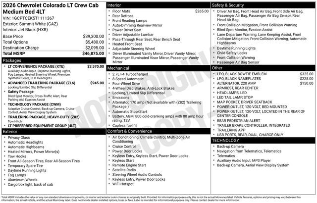 Discover the new Chevrolet Colorado at Salt Lake Valley Chevrolet in Salt Lake City! With bold design, modern technology, and reliable performance, Chevrolet makes every drive exciting. Whether it’s city streets or canyon roads, the Colorado is ready for anything. Call us today at 801-969-8221 to schedule a time to see it! --- 2026 Chevrolet Colorado Summit White 2.7L I4 Turbocharged DOHC 16V LEV3-ULEV50 310hp --- Final price excludes tax, tag, title, documentation fees, dealer-installed options, and any market-based pricing adjustments. Financing through GM Financial is required for all discounts to apply. Special finance offers may not be combined with certain factory incentives. While we strive for accuracy, errors may occur—please verify all information with a sales representative. For the most accurate pricing, call (801) 969-8221 or visit us in person. Prices and payments are subject to change based on manufacturer incentives.