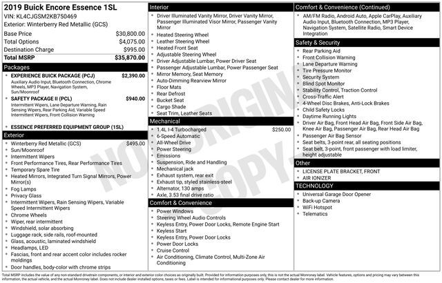 Take your drives to the next level with this Buick Encore from Salt Lake Valley Buick GMC! Engineered for a smooth ride, advanced convenience, and lasting dependability, this vehicle is ready to handle everything your day throws at you. Plus, enjoy a $1,000 finance savings, already included in the sale price, when you finance through one of our trusted lending partners. Looking for quality used cars in Salt Lake City? This Buick Encore delivers style, versatility, and value - perfect for daily commutes, family trips, or weekend adventures. Stop by Salt Lake Valley Buick GMC to see this vehicle in person and explore our wide selection of pre-owned cars, trucks, and SUVs. Browse online at www.slvbuickgmc.com or call 801-265-1511 to schedule your test drive today! With Experience Buick Package (18'' 7-Spoke Chromed Aluminum Wheels, Power Tilt-Sliding Moonroof, Radio: Buick Infotainment System AM/FM w/Nav, and SiriusXM Radio), Preferred Equipment Group 1SL (6-Speaker Audio System), Safety Package II (Air Ionizer, Forward Collision Alert, Lane Departure Warning System, Rainsense Intermittent Front Wipers, and Ultrasonic Front & Rear Park Assist), 18'' Aluminum Wheels, 3.53 Final Drive Axle Ratio, 4-Wheel Disc Brakes, 6 Speakers, 6-Way Power Driver Seat Adjuster, 6-Way Power Front Passenger Seat Adjuster, ABS brakes, Air Conditioning, Alloy wheels, AM/FM radio: SiriusXM, Apple CarPlay/Android Auto, Auto-dimming Rear-View mirror, Automatic temperature control, Brake assist, Bumpers: body-color, Compass, Delay-off headlights, Driver door bin, Driver vanity mirror, Driver's Seat Mounted Armrest, Dual front impact airbags, Dual front side impact airbags, Electronic Stability Control, Emergency communication system: OnStar and Buick connected services capable, Exterior Parking Camera Rear, Front anti-roll bar, Front Bucket Seats, Front dual zone A/C, Front fog lights, Front License Plate Bracket, Front reading lights, Front wheel independent suspension, Fully automatic headlights, Garage door transmitter, Heated door mirrors, Heated Driver & Front Passenger Seats, Heated front seats, Heated steering wheel, Illuminated entry, Knee airbag, Leather-Appointed Seat Trim, Low tire pressure warning, Memory seat, Occupant sensing airbag, Outside temperature display, Overhead airbag, Panic alarm, Passenger door bin, Passenger vanity mirror, Power door mirrors, Power driver seat, Power passenger seat, Power steering, Power windows, Radio data system, Radio: Buick Infotainment System AM/FM Stereo, Rear seat center armrest, Rear side impact airbag, Rear window defroster, Rear window wiper, Remote keyless entry, Ride & Handling Suspension, Roof rack: rails only, Security system, Speed control, Speed-sensing steering, Split folding rear seat, Spoiler, Steering wheel mounted audio controls, Tachometer, Telescoping steering wheel, Tilt steering wheel, Traction control, Trip computer, Turn signal indicator mirrors, and Variably intermittent wipers designed for convenience and enjoyment, this Buick Encore is ready to take you wherever you want to go.