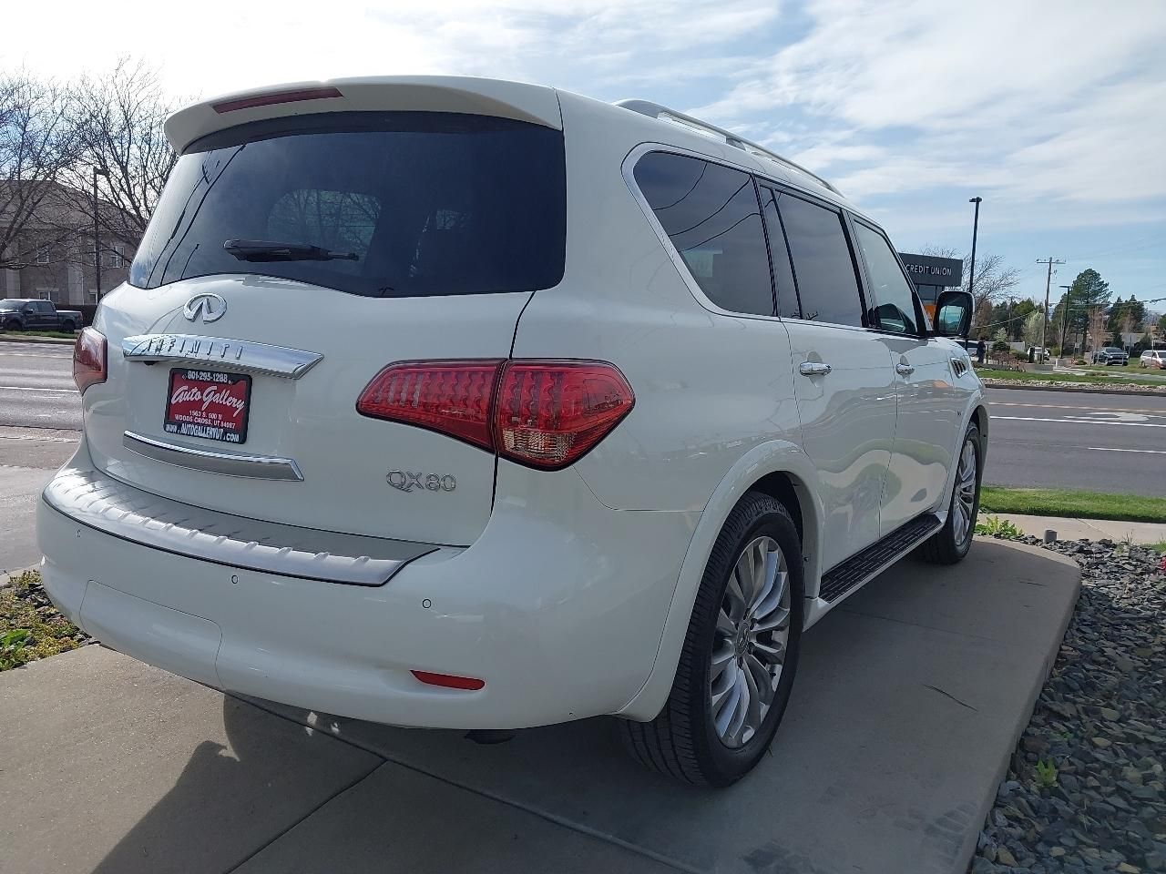 CLEAN TITLE!!! CLEAN CARFAX!!! AUTOGALLERYUT.COM 2016 INFINITI QX80 AWD, white with black LEATHER, SUNROOF, wheels, NAVIGATION SYSTEM with rear BACKUP CAMERA and side BLIND SPOT MONITORS, with ADAPTIVE CRUISE CONTROL and LANE KEEP ASSIST and LANE DEPARTURE WARNING, rear 3RD ROW SEATS, bluetooth connection with PREMIUM SOUND SYSTEM and steering wheel audio controls, a/c with climate control and rear a/c, front and rear HEATED SEATS with front COOLED SEATS and HEATED STEERING WHEEL, cross traffic alert, fog lights, keyless entry with keyless start, power rear liftgate, tinted windows, luggage rack, tow package, running boards, and tons more! Clean title! Remainder of Factory warranty or extended warranty available. The best used cars available in Bountiful, Woods Cross, Davis County, and Salt Lake City. For more pictures and details and to view our other used car inventory and cars like this please visit www.autogalleryut.com DL 4527 For assistance call or text 801-295-1288 Thank you and hope to hear from you soon! Visit Auto Gallery online at autogalleryut.com to see more pictures of this vehicle or call us at 801-295-1288 today to schedule your test drive.