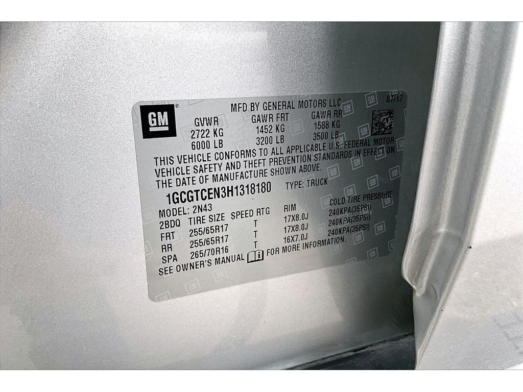 Equipment See what's behind you with the back up camera on this small pickup. This model features a hands-free Bluetooth phone system. Apple CarPlay: Seamless smartphone integration for it - stay connected and entertained on the go! When you encounter slick or muddy roads, you can engage the four wheel drive on this Chevrolet Colorado and drive with confidence. Maintaining a stable interior temperature in this 2017 Chevrolet Colorado is easy with the climate control system. A trailer braking system is already installed on the vehicle. Keep safely connected while in the Chevrolet Colorado with OnStar. You may enjoy services like Automatic Crash Response, Navigation, Roadside Assistance and Hands-Free Calling. The vehicle has a V6, 3.6L high output engine. It gleams with an elegant silver clear coated finish. The high efficiency automatic transmission shifts smoothly and allows you to relax while driving. This 2017 Chevrolet Colorado is equipped with a gasoline engine. Packages Preferred Equipment Group 4LT: 2-Speed Autotrac Electric Transfer Case. Automatic Locking Rear Differential. Heavy-Duty Trailering Package. Integrated Trailer Brake Controller. Front License Plate Kit. Equipment listed is based on original vehicle build and subject to change. Please confirm the accuracy of the included equipment by calling the dealer prior to purchase.
