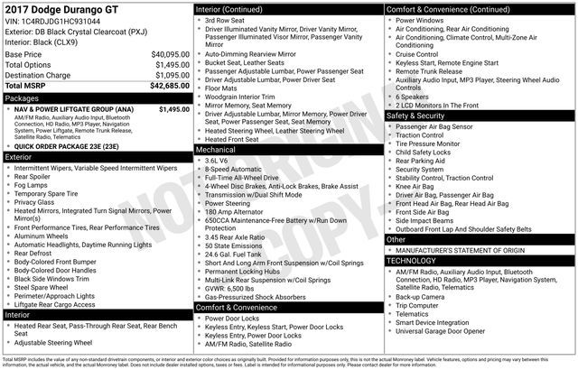 Turn every drive into something special with this Dodge Durango from Salt Lake Valley Chevrolet! Designed for comfort, performance, and style, this vehicle comes fully equipped with modern technology and convenience features you’ll love. Price excludes tax, title, license fee, government fees, and $449 dealer documentary service fee. While every reasonable effort is made to ensure accuracy, we are not responsible for errors or omissions, and vehicles may be sold prior to inquiry—please contact the dealer to confirm availability. All financing is subject to approved credit. If you’re shopping for used cars in Salt Lake City, or searching for the perfect SUV, truck, or sedan, this Dodge Durango delivers the dependability and value you’re looking for. It’s the ideal match for your lifestyle - ready for everything from mountain adventures to city commutes. Visit Salt Lake Valley Chevrolet today and see why so many Utah drivers trust us for great deals on quality pre-owned vehicles. Explore our inventory online at www.slvchevy.com or call 801-969-8221 to schedule your test drive today! This impressive vehicle includes Nav & Power Liftgate Group (5-Year SiriusXM Traffic Service, 5-Year SiriusXM Travel Link Service, GPS Navigation, HD Radio, Power Liftgate, Radio: Uconnect 3C Nav w/8.4'' Display, SiriusXM Traffic, and SiriusXM Travel Link), Quick Order Package 23E, 3.45 Rear Axle Ratio, 3rd row seats: split-bench, 4-Wheel Disc Brakes, 6 Speakers, 8.4'' Touchscreen Display, ABS brakes, Air Conditioning, Alloy wheels, AM/FM radio: SiriusXM, Anti-whiplash front head restraints, Audio memory, Auto-dimming door mirrors, Auto-dimming Rear-View mirror, Automatic temperature control, Brake assist, Bumpers: body-color, Compass, Delay-off headlights, Driver door bin, Driver vanity mirror, Dual front impact airbags, Dual front side impact airbags, Electronic Stability Control, Emergency communication system: Uconnect Access, Exterior Parking Camera Rear, Four wheel independent suspension, Front anti-roll bar, Front Bucket Seats, Front Center Armrest w/Storage, Front dual zone A/C, Front fog lights, Front reading lights, Fully automatic headlights, Garage door transmitter, GPS Antenna Input, Heated door mirrors, Heated front seats, Heated rear seats, Heated steering wheel, Illuminated entry, Integrated Voice Command w/Bluetooth, Knee airbag, Leather Trimmed Bucket Seats, Low tire pressure warning, Manufacturer's Statement of Origin, Memory seat, Nav-Capable! See Dealer for Details, Occupant sensing airbag, Outside temperature display, Overhead airbag, Overhead console, Panic alarm, Passenger door bin, Passenger vanity mirror, Power door mirrors, Power driver seat, Power passenger seat, Power steering, Power windows, Radio data system, Radio: Uconnect 3C w/8.4'' Display, Rear air conditioning, Rear anti-roll bar, Rear reading lights, Rear seat center armrest, Rear window defroster, Rear window wiper, Remote keyless entry, Roadside Assistance & 9-1-1 Call, Security system, Speed control, Speed-Sensitive Wipers, Split folding rear seat, Spoiler, Steering wheel mounted audio controls, Tachometer, Telescoping steering wheel, Tilt steering wheel, Traction control, Trip computer, Turn signal indicator mirrors, Variably intermittent wipers, and Wheels: 20'' x 8.0'' Premium Painted Aluminum, offering everything you need for your next adventure.