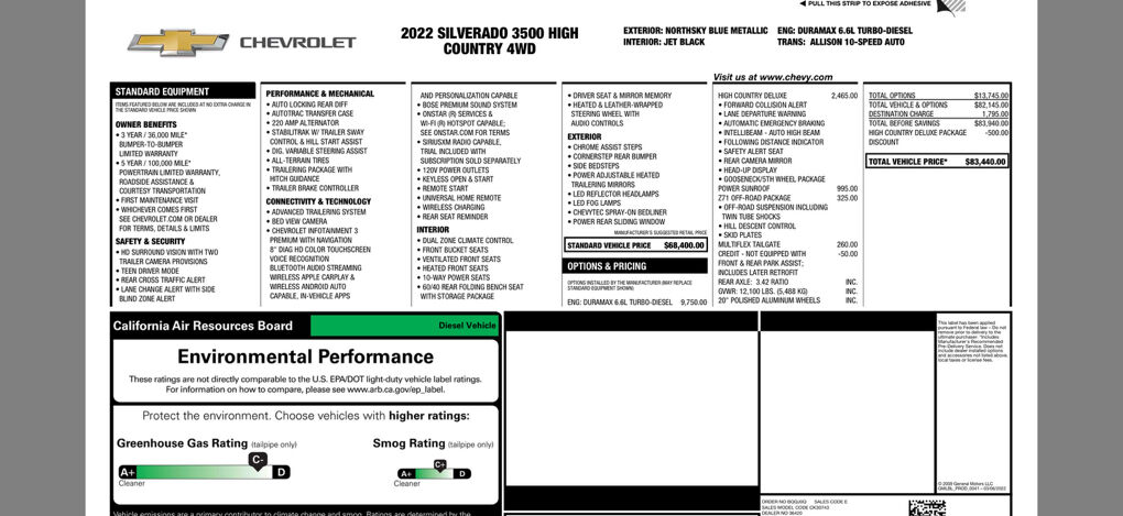 One owner custom truck, always garaged! Chevy High Country Deluxe trim (same as Denali on GMC). Clean CarFax and regularly maintained. Turbo diesel, sunroof, custom 2” lift and 35” tires with custom 20” rims. Blacked out and custom paint touches. Great truck with almost $20k of upgrades. Get the same engine and transmission (barely even broke in) as a new truck but with all the whistles and bells you would want to add!