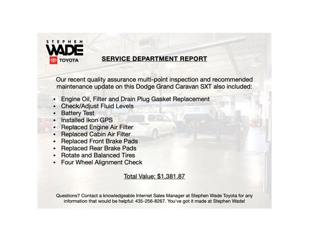CLEAN CARFAX. 2017 Dodge Grand Caravan SXT in White Knuckle Clear-Coat with Black / Light Graystone Leather and Suede. 3.6L V6 24-Valve VVT Engine, 6-Speed Automatic 62TW Transmission.Odometer is 9,504 miles below market average.CALL STEPHEN WADE TOYOTA: 435-241-3828.Customer Preferred Package 29P;Uconnect Hands-Free Group,Uconnect Voice Command with Bluetooth,Bluetooth Streaming Audio,Leather-Wrapped Steering Wheel,Leather-Wrapped Shift Knob,Auto-Dimming Rear View Mirror w/Microphone,Remote USB Port,SiriusXM Satellite Radio,Premium Interior Accents,Bright Side Roof Rails,Integrated Roof Rail Crossbars,Bright Belt Moldings,Automatic Headlamps,Fog Lamps,Power 8-Way Driver Seat,Power 2-Way Driver Lumbar Adjust,Remote Start System,Security Alarm,Black Finish Instrument Panel Bezel,Highline Door Trim Panel.Compact Spare Tire.Flex Fuel Vehicle.SERVICE REPORT: At Stephen Wade Toyota, we do more to insure we offer the most mechanically sound pre-owned vehicles with maintenance that is up to date. Our recent quality assurance multi-point inspection and recommended maintenance update on this Dodge Grand Caravan SXT also included an engine oil, filter and drain plug gasket replacement, check/adjust fluid levels, battery test, installed Ikon GPS, replaced engine air filter, replaced cabin air filter, replaced front brake pads, replaced rear brake pads, rotate and balanced tires and a four wheel alignment check - a $1,381.87 value.MARKET REPORT: We use advanced software to shop the automotive marketplace nationwide everyday. This allows us to competitively offer you the best value one can find anywhere. Contact our knowledgeable Internet sales managers; Danny, Jessica or Wesley at Stephen Wade Toyota for a priority test drive, or for any information that would be helpful: 435-241-3828. You've got it made at Stephen Wade!