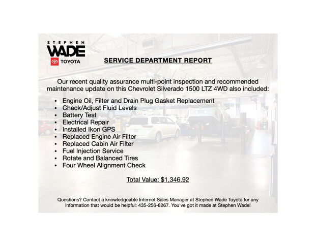 CLEAN CARFAX. 2021 Chevrolet Silverado 1500 Crew LTZ 4WD in Satin Steel Metallic with Gideon/Very Dark Atmosphere Leather. 5.3L EcoTec3 V8, 8-Speed Automatic Transmission, 4-Wheel Drive.Odometer is 37,185 miles below market average!CALL STEPHEN WADE TOYOTA: 435-241-3828.Preferred Equipment Group 1LZ.LTZ Convenience Package II.Z71 Off Road Package.Chevytec Spray-On Bedliner.Underseat Storage.Front Black Bowtie Emblem.SERVICE REPORT: At Stephen Wade Toyota, we do more to insure we offer the most mechanically sound pre-owned vehicles with maintenance that is up to date. Our recent quality assurance multi-point inspection and recommended maintenance update on this Chevrolet Silverado 1500 LTZ also included an engine oil, filter and drain plug gasket replacement, check/adjust fluid levels, battery test, electrical repair, installed Ikon GPS, replaced engine air filter, replaced cabin air filter, fuel injection service, rotate and balanced tires and a four wheel alignment check - a $1,346.92 value.MARKET REPORT: We use advanced software to shop the automotive marketplace nationwide everyday. This allows us to competitively offer you the best value one can find anywhere. Contact our knowledgeable Internet sales managers; Danny, Jessica or Wesley at Stephen Wade Toyota for a priority test drive, or for any information that would be helpful: 435-241-3828. You've got it made at Stephen Wade!
