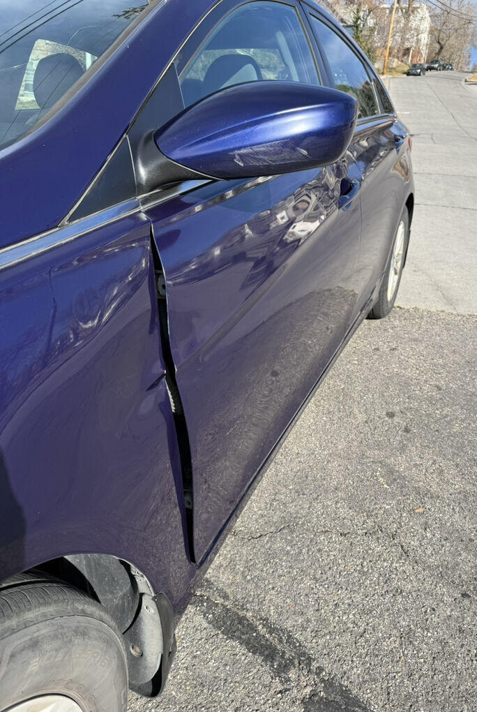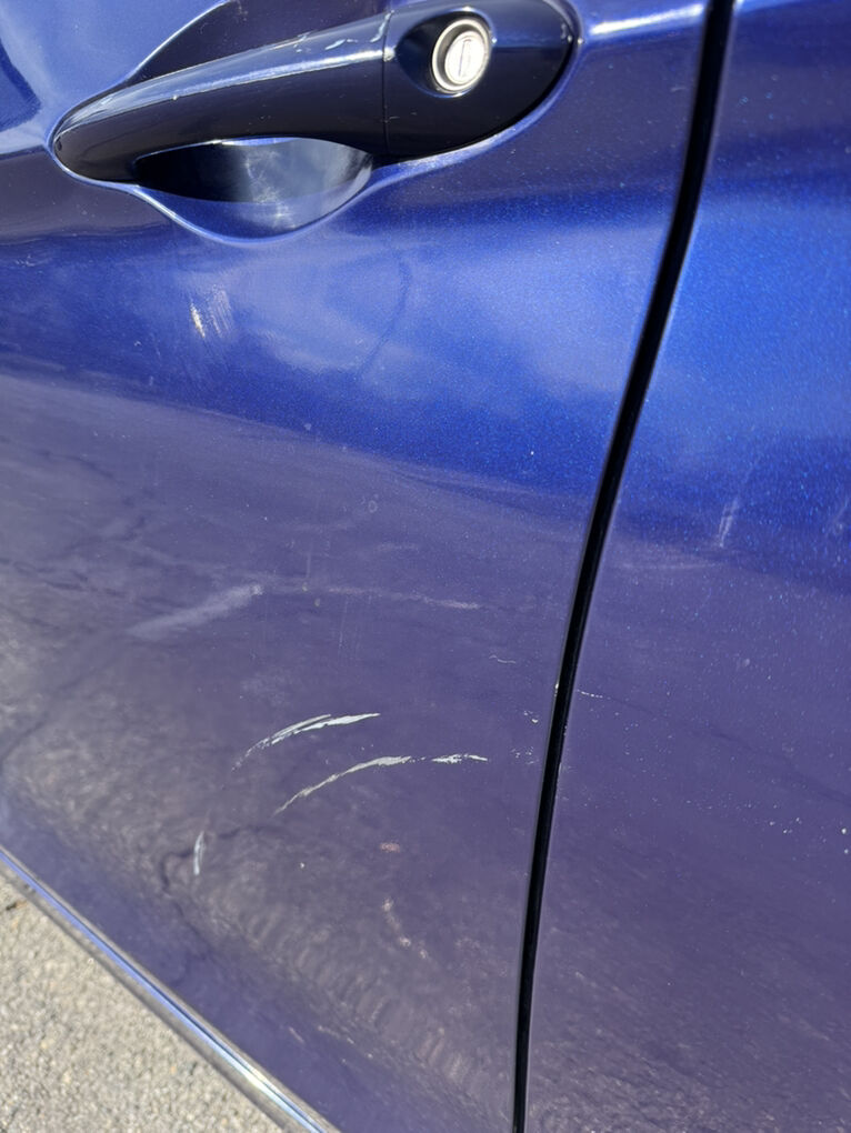 There is cosmetic damage on the front driver side from a recent low-speed accident (scratches, dent, bumper alignment). Due to this damage, the driver-side door does not open fully but does open and close and functions. The damage appears cosmetic only and the car drives normally.