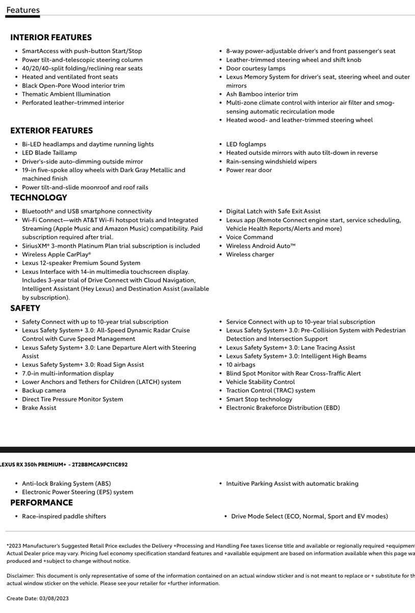 Price reduced. For sale is my 2023 Lexus RX 350h, a luxury hybrid SUV that blends comfort, efficiency, and reliability. The vehicle is in excellentcondition and has been garage-kept since purchase, which shows in both the interior and exterior. It has been well cared for and maintained, with no issues.