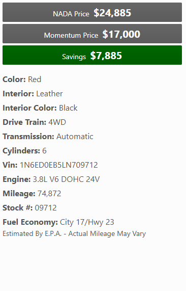 2020 Nissan Frontier Pro-4X with 74k miles! 4WD, 3.8L, bed liner, heated leather seats, Nav, backup camera, and more! At Momentum Motors we SELL cars at trade-in prices. We know you work hard for your money, and we want to help you save it. Our company specializes in branded title vehicles which allows our customers to get a quality vehicle for the lowest prices in Utah. Our team hand picks our inventory from insurance auctions all over the country. Each vehicle is repaired in a professional facility with all the proper safety equipment. Unlike the big branded dealerships, we oversee and manage the entire repair process to make sure every vehicle is built to the Momentum Motors standard.. Stop by and see if we can help you find your next car !We are located at 616 S Main St Spanish Fork, Utah. Or call/text 801-804-5364. We buy late model Branded Title Vehicles and accept them on Trade. Call us or bring your Branded Title vehicle by our lot for an instant cash offer. We also pay top dollar for lightly damaged vehicles.