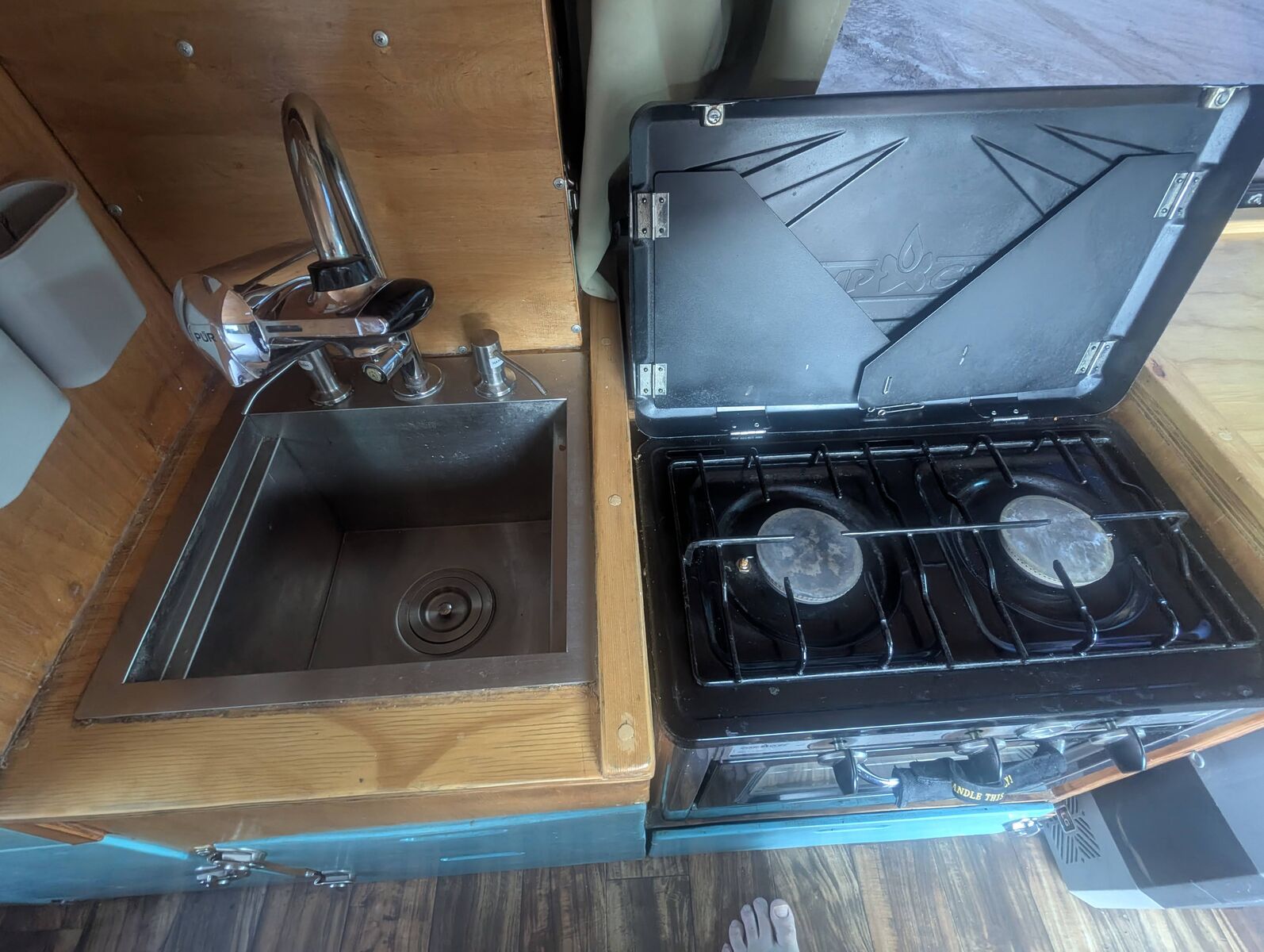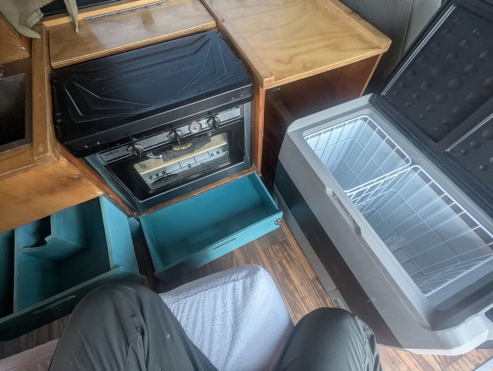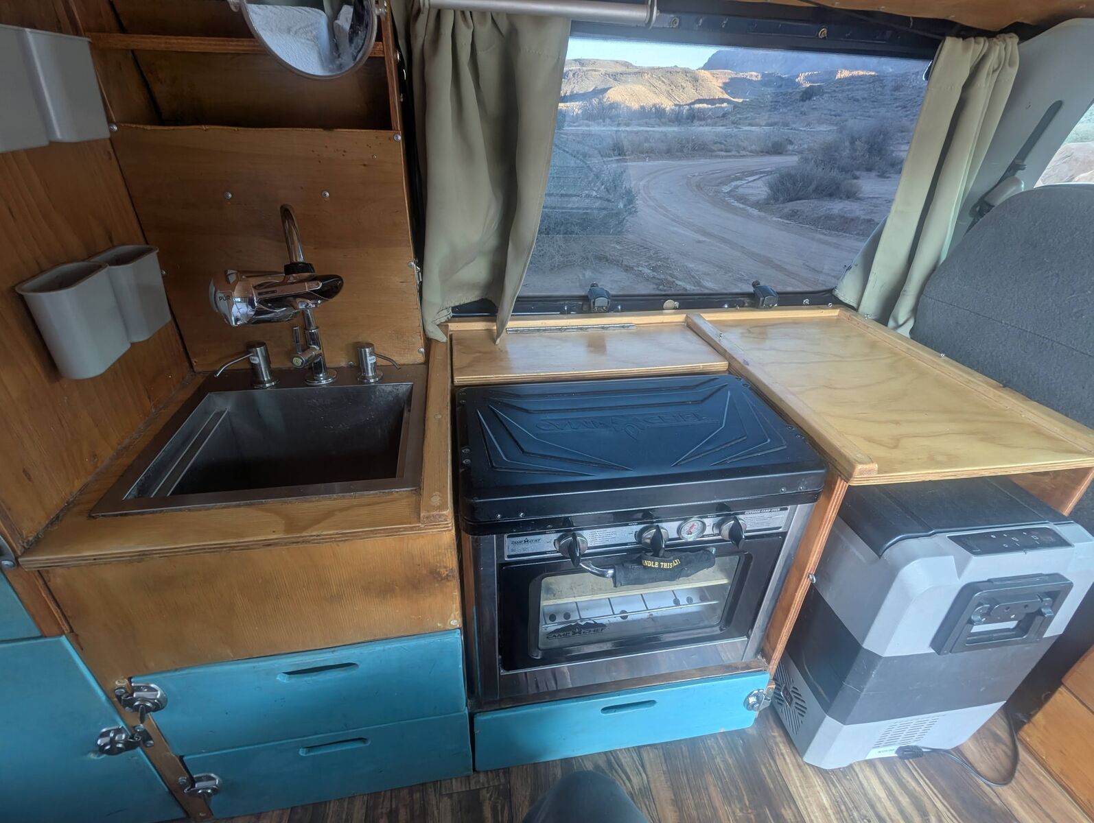 -Full galley setup with sink, Camp Chef propane oven/2 burner stove combo, 12v refrigerator, and ample drawer space.