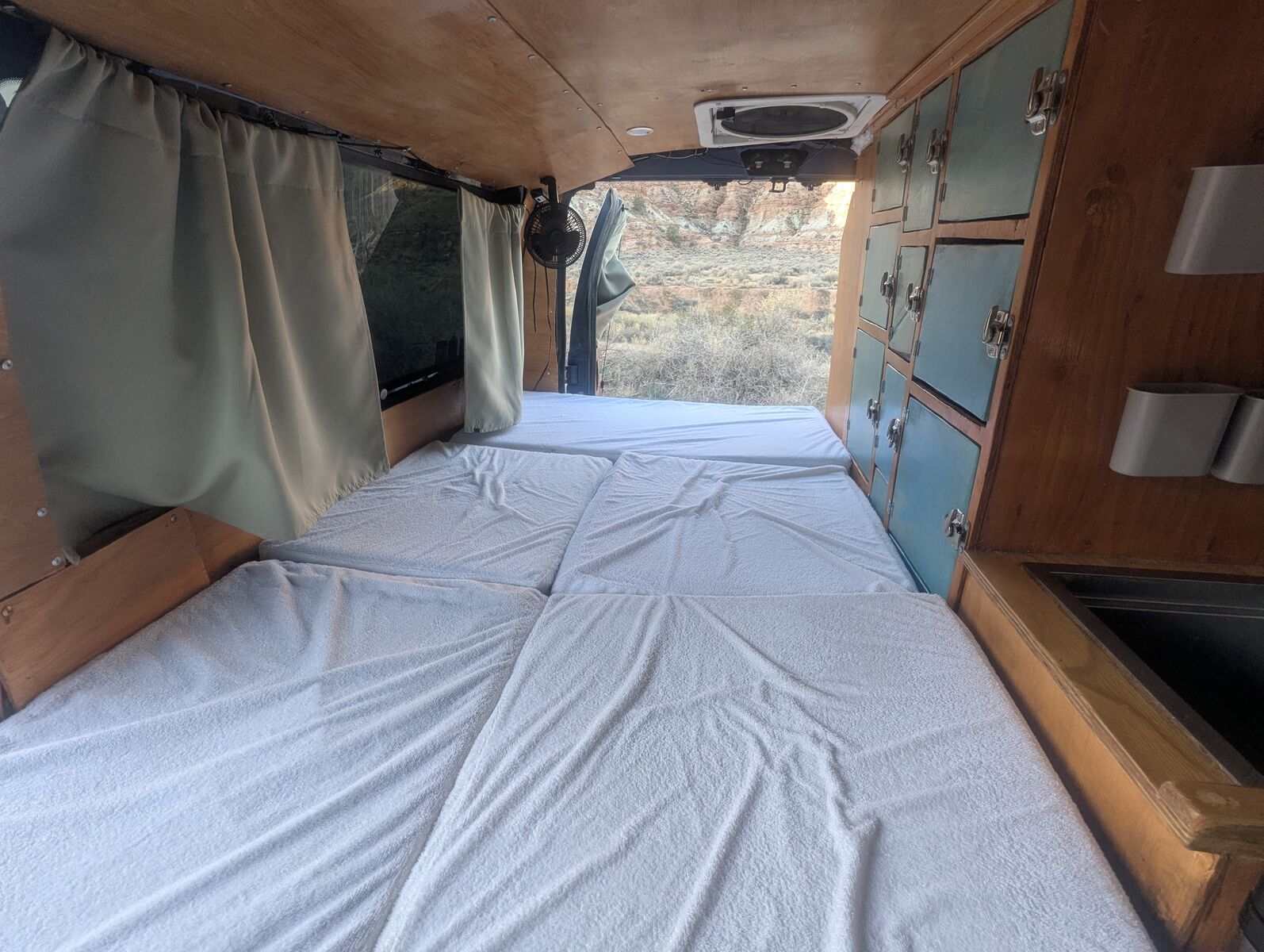 -2 Maxxair fans at the front and the rear to help keep it cool when it's hot out. Fans are set up with one to draw air in and the other as an exhaust to maximize circulation, even when all windows are closed.
