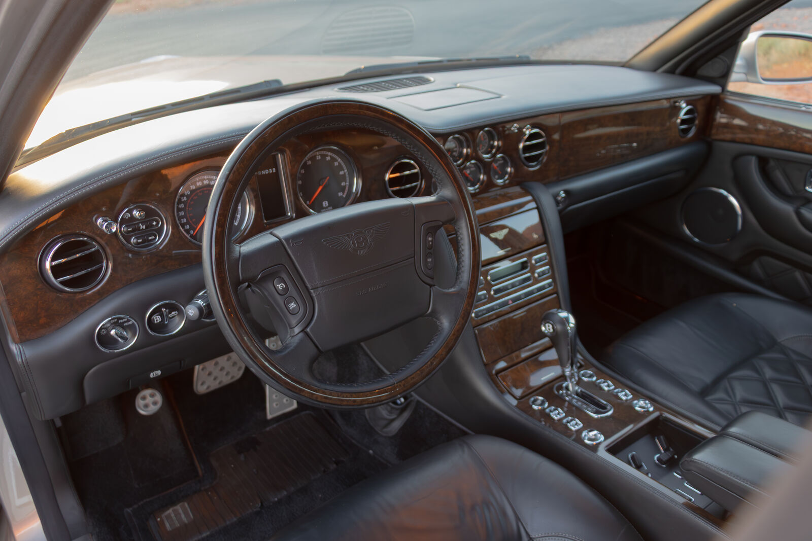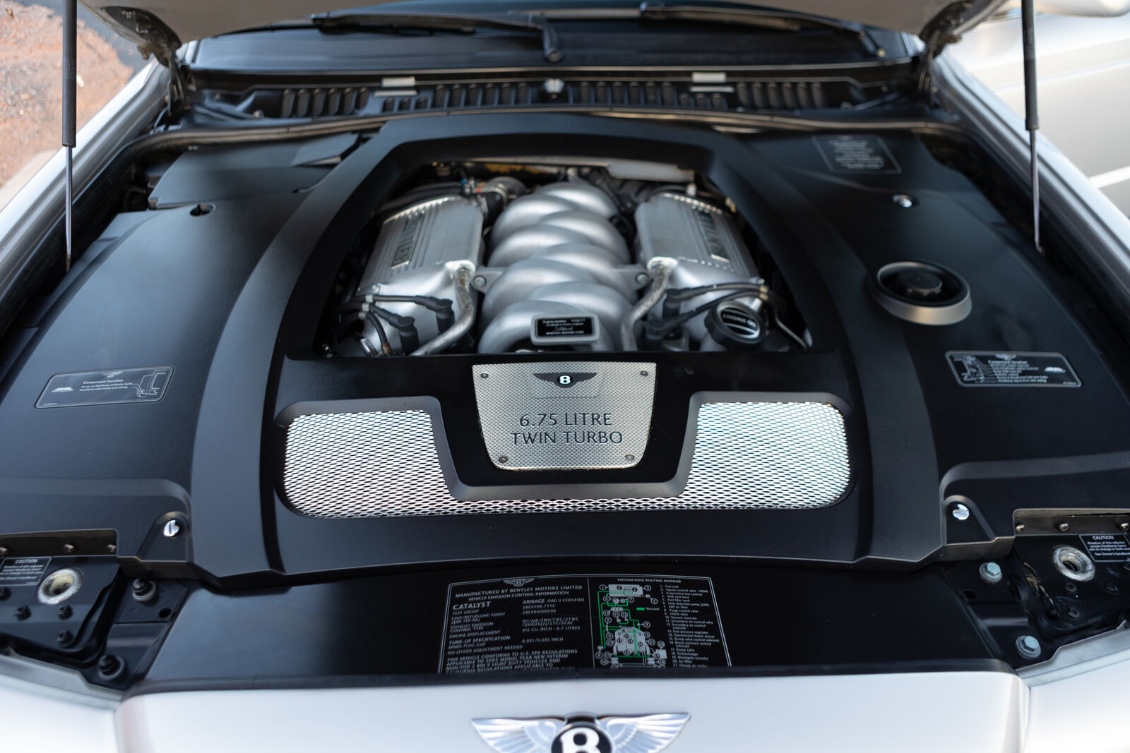 This 2005 Bentley Arnageis finished in Silverover Blackinterior. Power is provided by a 6.75 liter engine driving the rearwheels through an 4-Speedtransmission.