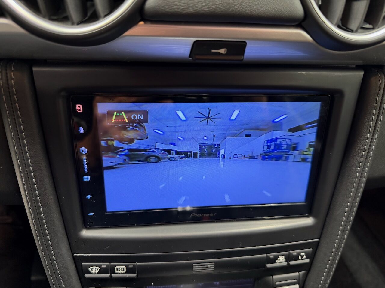The interior features black leather seating with a matching black dash, center console, and door panels. Amenities include Sport Chrono Package, alcantara headliner, and aftermarket Pioneer touch-screen head unit with rear view camera