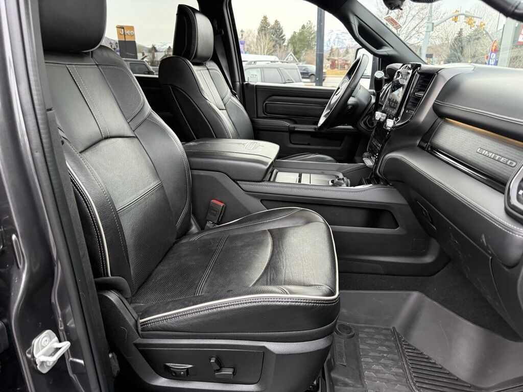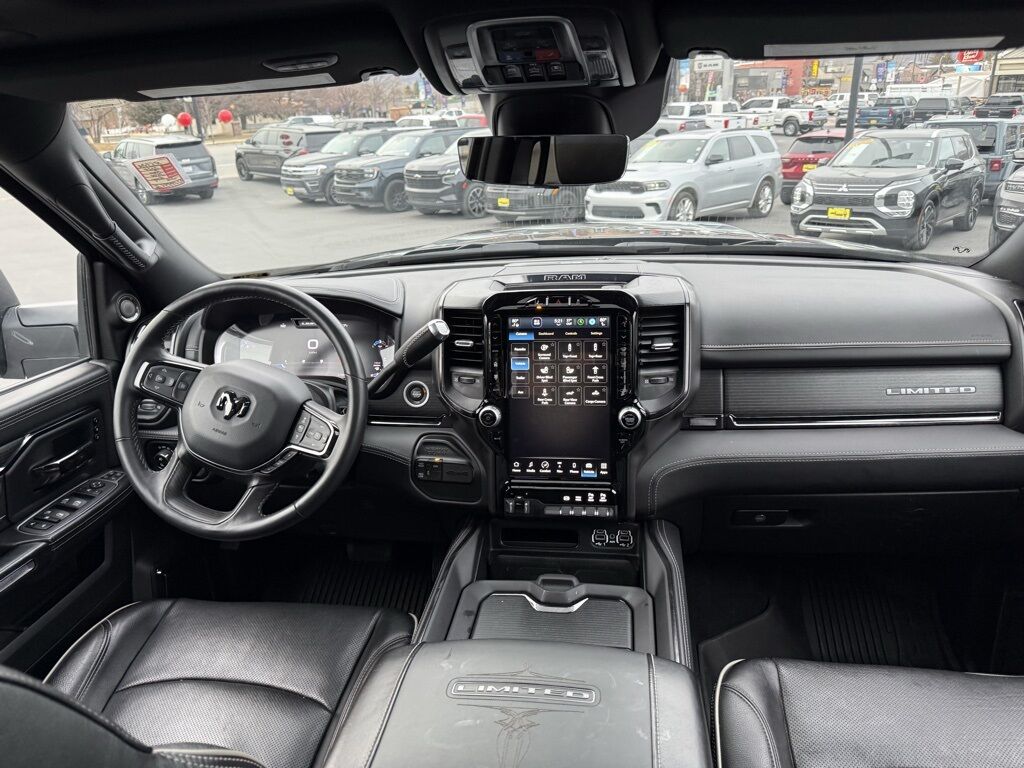 10 Speakers, 12'' Touchscreen Display, 17 Speaker harman/kardon Premium Sound, 3.73 Axle Ratio, 4 Adjustable Cargo Tie-Down Hooks, 4-Wheel Disc Brakes, 4G LTE Wi-Fi Hot Spot, ABS brakes, Active Noise Control System, Adaptive Cruise Control w/Stop, Adaptive Steering System, Adjustable pedals, Air Conditioning, Alexa Built-In, Alloy wheels, AM/FM radio: SiriusXM with 360L, Apple CarPlay, Apple CarPlay/Android Auto, Audio memory, Auto High-beam Headlights, Auto-dimming door mirrors, Auto-dimming Rear-View mirror, Automatic temperature control, Bodyside moldings, Brake assist, Bumpers: body-color, Center Hub, Center Stop Lamp w/Cargo View Camera, Compass, Connected Travel & Traffic Services, Connectivity - US/Canada, Delay-off headlights, Digital Rearview Mirror, Disassociated Touchscreen Display, Driver door bin, Driver vanity mirror, Dual front impact airbags, Dual front side impact airbags, Electronic Stability Control, Electronically Controlled Throttle, Engine Block Heater, For Details, Visit DriveUconnect.com, For More Info, Call 800-643-2112, Front anti-roll bar, Front Bucket Seats, Front Center Armrest w/Storage, Front dual zone A/C, Front fog lights, Front License Plate Bracket, Front reading lights, Full Speed Forward Collision Warning Plus, Fully automatic headlights, Garage door transmitter, Genuine wood console insert, Genuine wood dashboard insert, Genuine wood door panel insert, Global Telematics Box Module (TBM), Google Android Auto, GPS Antenna Input, GPS Navigation, HD Radio, Heated door mirrors, Heated front seats, Heated rear seats, Heated steering wheel, Illuminated entry, Instrument Cluster Theme 8, Integrated Voice Command w/Bluetooth, Lane Keep Assist, Leather steering wheel, LED Bed Lighting, Limited Leather Bucket Seats, Limited Level 1 Equipment Group, Low tire pressure warning, Luxury Door Trim Panel (CTH), Manufacturer's Statement of Origin, Memory seat, MOPAR Front & Rear Rubber Floor Mats, MOPAR Spray In Bedliner, Navigation System, Occupant sensing airbag, Off-Road Information Pages, Outside temperature display, Overhead airbag, Overhead console, Panic alarm, ParkView Rear Back-Up Camera, Passenger door bin, Passenger vanity mirror, Pedal memory, Power Deployable Running Boards, Power door mirrors, Power driver seat, Power passenger seat, Power steering, Power Sunroof, Power windows, Quick Order Package 2HM Limited, Radio data system, Radio: Uconnect 5 Nav w/12.0'' Display, Radio: Uconnect 5 Nav w/8.4'' Display, Rain sensing wipers, RamBox Cargo Management System, Ramcharger Wireless Charging Pad, Rear anti-roll bar, Rear reading lights, Rear seat center armrest, Rear step bumper, Rear window defroster, Remote keyless entry, Security system, Selectable Tire Fill Alert, SiriusXM Radio Service, SiriusXM w/360L, Speed control, Split folding rear seat, Steering wheel mounted audio controls, Surround View Camera System, Tachometer, Tilt steering wheel, Tip Start, Traction control, Trailer Reverse Guidance, Trailer Tow Pages, Trip computer, Truck Bed Cargo Divider, Turn signal indicator mirrors, Variably intermittent wipers, Vendor Painted Cargo Box, Vendor Painted Cargo Box Tracking, Ventilated front seats, Voltmeter, Wheels: 20'' x 8.0'' Diamond Cut Face Aluminum, Wheels: 20'' x 8.0'' Satin Carbon w/Chrome Inserts.