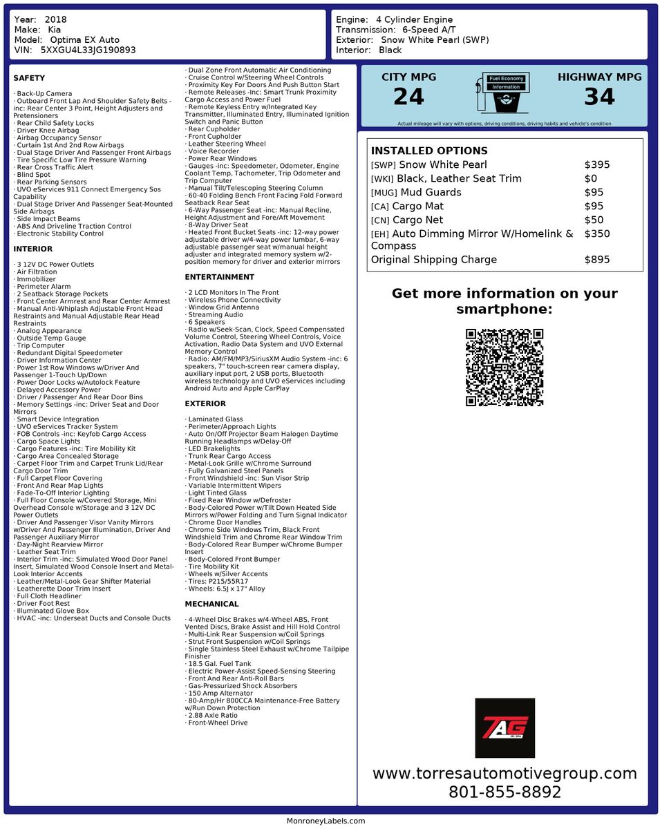 Practicality is exemplified in the Optima's remote start with push button- allowing drivers to seamlessly enter and start the vehicle without fumbling for keys. Additionally- the inclusion of option group 030 showcases a dedication to safety and convenience- featuring advanced systems and driver assistance technologies. All these elements come together to create a well-rounded vehicle that caters to the demands of both drivers and passengers- making the 2018 Kia Optima EX Auto an excellent choice for those seeking style- efficiency- and modern features in a sedan.