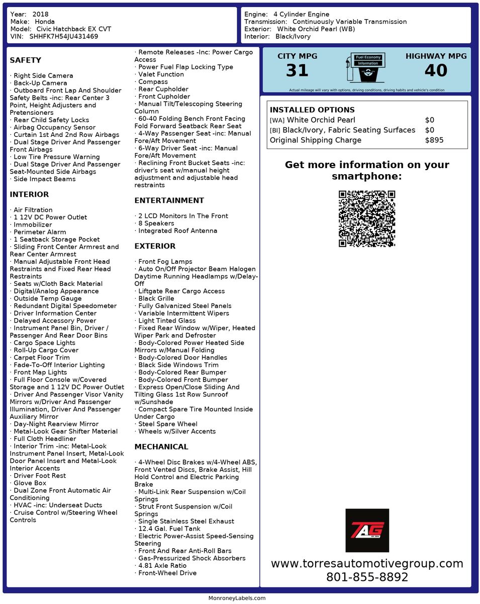 The 2018 Honda Civic Hatchback EX CVT is a stunning blend of modern design and efficient performance- perfectly crafted to elevate your driving experience. Painted in the elegant White Orchid Pearl- this vehicle exudes a sophisticated and timeless appeal- making it a standout presence on the road. Its aerodynamic profile- coupled with sleek lines and a distinctive front grille- adds to its sporty yet refined look.