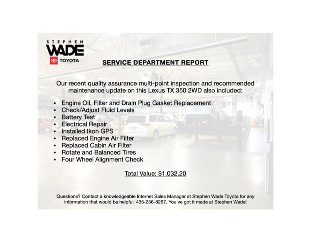 ONE OWNER CLEAN CARFAX. 2024 Lexus TX 350 2WD in Caviar with Black NuLuxe. 2.4L 4-Cylinder Turbo Engine, 8-Speed Automatic Transmission, Front Wheel Drive.21/27 City/Highway MPG.CALL STEPHEN WADE TOYOTA: 435-241-3828.Cold Area Package: Windshield Wiper De-icer, Heated Steering Wheel.Digital Key Capability.USB Phone Charging Cables.20-Inch Black Wheels.Illuminated Door Sills.Key Gloves.SERVICE REPORT: At Stephen Wade Toyota, we do more to insure we offer the most mechanically sound pre-owned vehicles with maintenance that is up to date. Our recent quality assurance multi-point inspection and recommended maintenance update on this Lexus TX 350 also included an engine oil, filter and drain plug gasket replacement, check/adjust fluid levels, battery test, electrical repair, installed Ikon GPS, replaced engine air filter, replaced cabin air filter, rotate and balanced tires and a four wheel alignment check - a $1,032.20 value.MARKET REPORT: We use advanced software to shop the automotive marketplace nationwide everyday. This allows us to competitively offer you the best value one can find anywhere. Contact our knowledgeable Internet sales managers; Danny, Jessica or Wesley at Stephen Wade Toyota for a priority test drive, or for any information that would be helpful: 435-241-3828. You've got it made at Stephen Wade!
