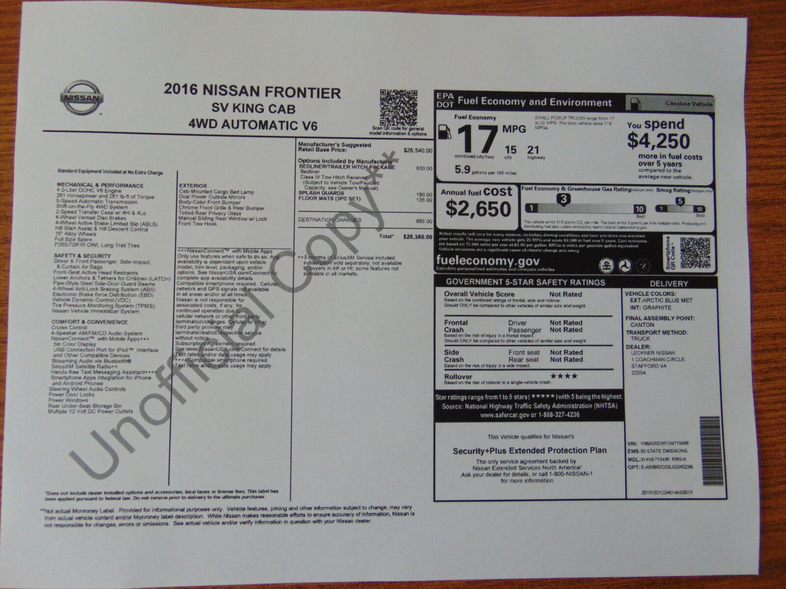 2016 NISSAN FRONTIER, SV, KING CAB, SHORT BED, 4.0L V6, AUTOMATIC, 2 SPEED TRANSFER CASE WITH HIGH AND LOW RANGE, 4X4, 104,391 MILES, 5 SPEED AUTOMATIC,DARK GRAY CLOTH INTERIOR, 4 PASSENGER SEATING, POWER WINDOWS, LOCKS, AND MIRRORS, TILT, CRUISE, CD PLAYER WITH STEERING WHEEL AUDIO CONTROLS, 5 INCH COLOR DISPLAY, BLUETOOTH, XM RADIO, DROP IN BEDLINER, TOW PACKAGE, GOOD MICHELIN TIRES. 2 OWNERS WITH NO ACCIDENTS AND 12 SERVICE RECORDS FROM A DRY CLIMATE. CLEAN TITLE AND ACTUAL MILES. THIS NISSAN IS IN EXCELLENT CONDITION!