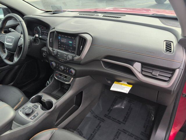 VOLCANIC RED TINTCOAT,AT4 PREFERRED EQUIPMENT GROUP includes standard equipment,AXLE 3.47 FINAL DRIVE RATIO,SAFETY ALERT SEAT,ENGINE 1.5L TURBO DOHC 4-CYLINDER SIDI VVT (175 hp [131.3 kW] @ 5800 rpm 203 lb-ft of torque [275.0 N-m] @ 2000 - 4000 rpm) (STD),HEAD-UP DISPLAY,TERRAIN PRO SAFETY PLUS includes (KSG) Adaptive Cruise Control (HS1) Safety Alert Seat and (UD7) Rear Park Assist; in addition to standard (PDO) GMC Pro Safety,REAR CROSS TRAFFIC ALERT,LANE CHANGE ALERT WITH SIDE BLIND ZONE ALERT,HD SURROUND VISION,ADAPTIVE CRUISE CONTROL,SIDE BLIND ZONE AND REAR CROSS TRAFFIC includes (UKC) Lane Change Alert with Side Blind Zone Alert and (UFG) Rear Cross Traffic Alert.,JET BLACK PERFORATED LEATHER-APPOINTED SEAT TRIM WITH AT4 LOGO,SEATS FRONT BUCKET (STD),FRONT AND REAR PARK ASSIST,TECH PACKAGE Includes (UV2) HD Surround Vision (UV7) Head-Up Display and (UD5) Front and Rear Park Assist.),TRANSMISSION 9-SPEED AUTOMATIC 9T45 ELECTRONICALLY-CONTROLLED WITH OVERDRIVE (STD),LICENSE PLATE FRONT MOUNTING PACKAGE (will be forced on orders with ship-to states that require a front license plate),AUDIO SYSTEM 8 DIAGONAL GMC INFOTAINMENT SYSTEM includes multi-touch display AM/FM/SiriusXM stereo Bluetooth streaming audio for music and most phones Android Auto and Apple CarPlay capability for compatible phones advanced voice recognition in-vehicle apps personalized profiles for infotainment and vehicle settings (STD),Mirror Memory,Seat Memory,Lane Departure Warning,Lane Keeping Assist,Front Collision Mitigation,Front Collision Warning,Automatic Highbeams,Turbocharged,Keyless Start,All Wheel Drive,ABS,4-Wheel Disc Brakes,Aluminum Wheels,Tires - Front All-Season,Tires - Rear All-Season,Temporary Spare Tire,Automatic Headlights,Automatic Headlights,Daytime Running Lights,Fog Lamps,Privacy Glass,Heated Mirrors,Power Mirror(s),Integrated Turn Signal Mirrors,Remote Trunk Release,Power Liftgate,Hands-Free Liftgate,AM/FM Stereo,Satellite Radio,MP3 Capability,Bluetooth Connection,Smart Device Integration,Requires Subscription,Satellite Radio,Requires Subscription,Bluetooth Connection,WiFi Hotspot,Bluetooth Connection,Smart Device Integration,Bucket Seats,Leather Seats,Heated Front Seat(s),Power Driver Seat,Driver Adjustable Lumbar,Driver Adjustable Lumbar,Power Passenger Seat,Passenger Adjustable Lumbar,Passenger Adjustable Lumbar,Pass-Through Rear Seat,Rear Bench Seat,Floor Mats,Floor Mats,Steering Wheel Audio Controls,Heated Steering Wheel,Tire Pressure Monitor,Trip Computer,Power Windows,Power Windows,Power Windows,Power Door Locks,Keyless Entry,Power Door Locks,Security System,Remote Engine Start,Cruise Control,Universal Garage Door Opener,Security System,Power Outlet,MP3 Capability,Auxiliary Audio Input,Climate Control,Multi-Zone A/C,A/C,Auto-Dimming Rearview Mirror,Automatic Highbeams,Front Collision Mitigation,Front Collision Warning,Traction Control,Stability Control,Front Collision Mitigation,Driver Air Bag,Passenger Air Bag,Front Side Air Bag,Front Head Air Bag,Rear Head Air Bag,Passenger Air Bag Sensor,Back-Up Camera,Telematics,Requires Subscription,Front Collision Warning,Lane Departure Warning,Lane Keeping Assist,Driver Restriction Features,Tire Pressure Monitor,Telematics,WiFi Hotspot,Requires Subscription