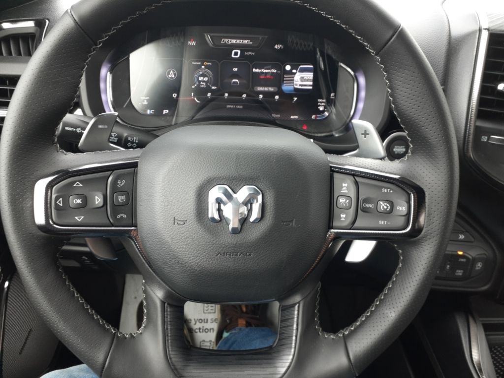 G/T Package: Floor Console; Under Seat Lighting; Leather/vinyl Bucket Seats; G/T Decal; Leather Wrapped Shift Knob; Leather-Wrapped Steering Wheel; Steering Wheel Mounted Shift Control; G/T Exhaust; GT Interior Theme; MOPAR Bright Pedal Kit; Performance Pages,Quick Order Package 21W Rebel,Rebel Level 2 Equipment Group: Google Android Auto; SiriusXM Radio Service; USB Host Flip; Rear Window Defroster; Rain Sensitive Windshield Wipers; Integrated Center Stack Radio; Power Adjustable Pedals with Memory; Front Passenger Interactive Display; Integrated Voice Command with Bluetooth; Connectivity - US/Canada; Auto Power-Folding Mirrors; GPS Navigation; 4G LTE Wi-Fi Hot Spot; 115V Auxiliary Rear Power Outlet; GPS Antenna Input; Media Hub with 2 Charge Only USBs; Exterior Mirrors with Heating Element; Proximity Approach/departure Lamps; Auto Dim Exterior Driver Mirror; SiriusXM with 360L; Accent Color Door Handles; Global Telematics Box Module; Connected Travel and Traffic Services; Heated Second Row Seats; Power Adjust 8-Way Front Passenger Seat; Security Alarm; Apple CarPlay; Black Painted Exterior Mirrors Caps; Off-Road Information Pages; Exterior Mirrors Approach Lamps; Disassociated Touchscreen Display; HD Radio; Smartphone as a Key Capable; 14.4" Touchscreen Display; Accent Color Premium Power Mirrors; Dual Wireless Charging Pad; Exterior Mirrors with Supplemental Signals; Exterior Mirrors Courtesy Lamps; Uconnect 5 Nav with 14.4" Display; Harman/kardon 19 Speaker Premium Sound; 2-Door Passive Entry, Front Door Locks; Accent Color Tailgate Handle; Exterior Mirrors with Memory; Driver Seat Memory; Power Tailgate; Convex Wide-Angle Exterior Mirror Insert; Radio/driver Seat/mirrors/pedals Memory,RamBox Cargo Management System,Trailer Brake Control,Forged Blue Metallic,Forged Blue Metallic,MyFlexCare Service Plan,Forward Collision Warning-Plus,Power open and close tailgate,Ventilated driver and front passenger seats,Integrated navigation system with voice activation,Blind Spot Detection,Keyfob remote start,Heated steering wheel,Uconnect w/Bluetooth handsfree wireless device connectivity,Apple CarPlay/Android Auto smart device wireless mirroring,Heated driver and front passenger seats,Leather and leatherette front seat upholstery,Driver seat with 8-way directional controls,Front passenger seat with 8-way directional controls,RamBox integrated pickup box storage,Keyfob trunk control,14.4 inch primary display,Pedestrian Emergency Braking,4G LTE Wi-Fi Hot Spot mobile hotspot internet access,ParkView rear mounted camera,Active Lane Management System,Adaptive cruise control with stop and go,Brake Assist predictive brake assist system,Cruise control with steering wheel mounted controls,Heated rear seats,Primary monitor touchscreen,Cross Path Detection collision warning,Driver seat power reclining, lumbar support, cushion tilt, fore/aft control and height adjustable control,Part and full-time 4WD,Hurricane 3L I-6 gasoline direct injection, DOHC, variable valve control, twin turbo, regular unleaded, engine with 420HP,Hurricane 3L I-6 DOHC,Smart key with hands-free access and push button start,Smart device remote start,Push-button,Front passenger touchscreen,Bluetooth wireless audio streaming,Smartphone As A Key Capable smart device-as-key proximity door locks,Gauge cluster display size: 12.00,Following distance alert,Dual-zone front climate control,Selec-Speed Control off-road speed control,Full gauge cluster screen,Auto high-beam headlights,Sentry Key immobilizer,Harman/kardon speakers,Active noise cancellation,Connected Travel & Traffic Services real-time traffic,Trailer brake controller,Trailer sway control,Uconnect external memory control,Internet radio capability