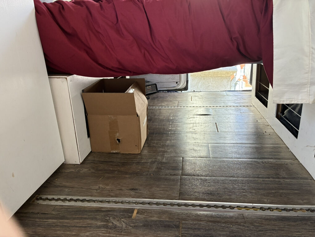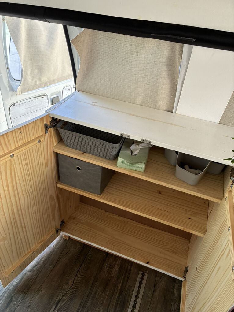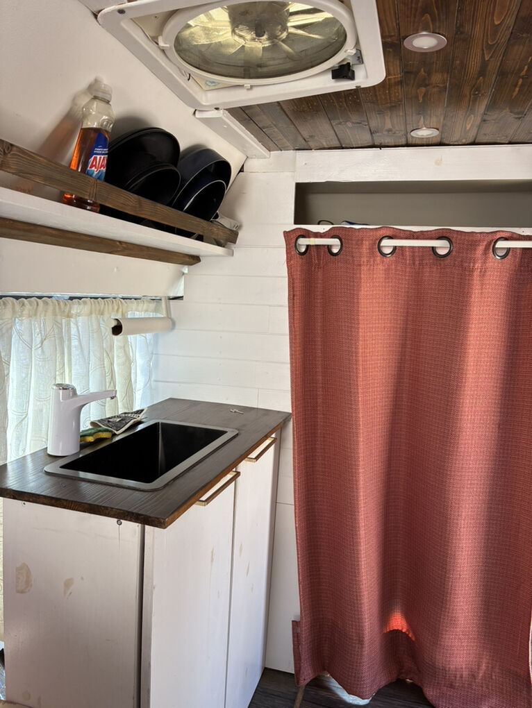 This van is pretty basic, when I built it, I made it fit me. I am 5ft 5 and my head barely touches the ceiling. It doesn't have a bathroom nor a fridge installed, but I do have wires ran to hook one up if you want to add one. Or.. you can take everything out and re-customize it.