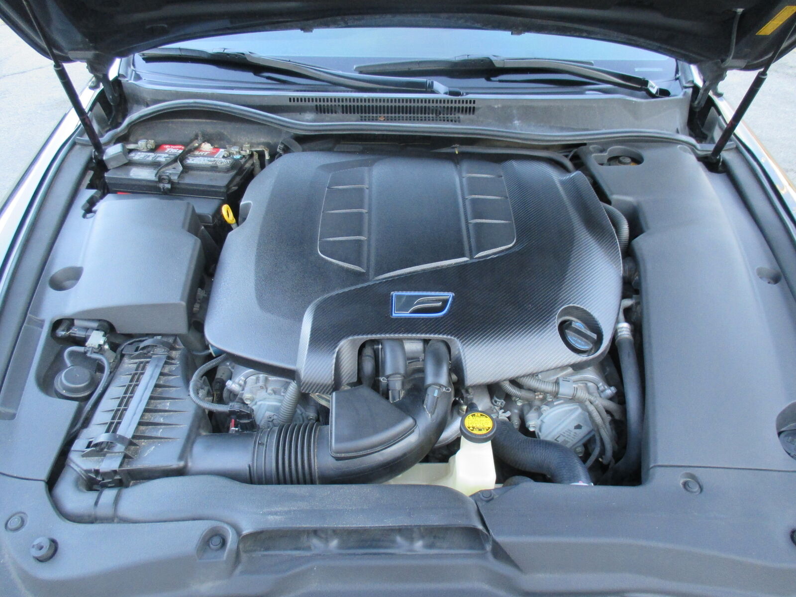 The 2012 Lexus IS F is a high-performance luxury sedan featuring a 5.0L naturally aspirated V8 engine (2UR-GSE) producing 416 hp at 6,600 rpm and 371 lb-ft of torque at 5,200 rpm. It comes with an 8-speed automatic transmission and rear-wheel drive, capable of 0-60 mph in 4.5 seconds.