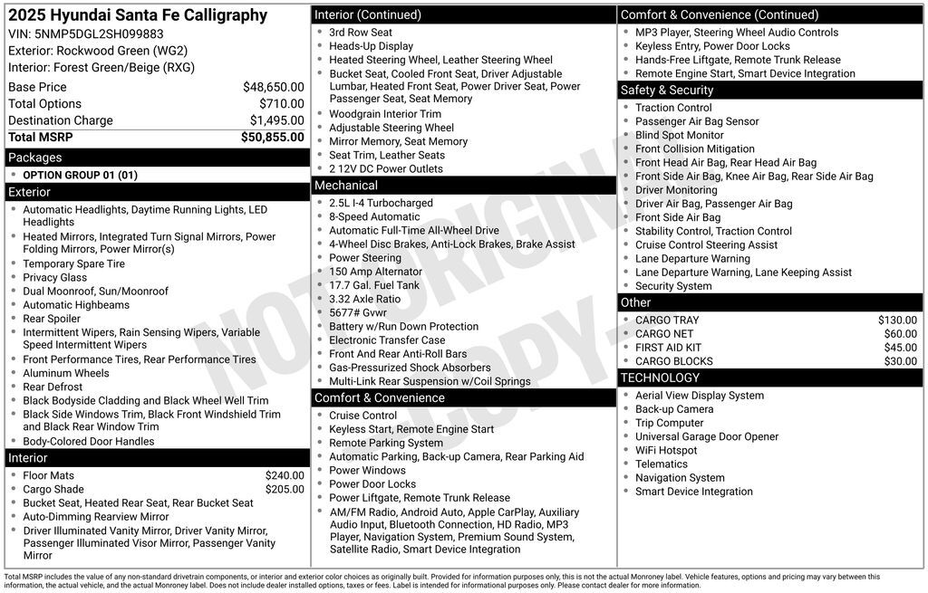 With its blend of upscale comfort, cutting edge technology, and certified assurance of quality, the 2025 Hyundai Santa Fe Calligraphy is an exceptional choice for families and drivers who expect more from their SUV.