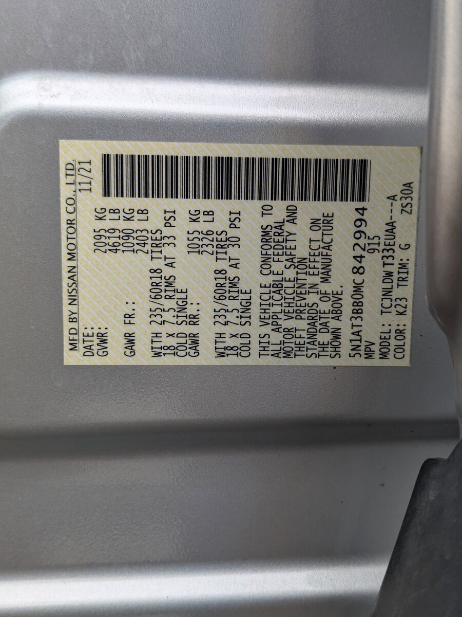 AWD, 18 Aluminum Alloy Wheels, 4-Wheel Disc Brakes, 5.604 Axle Ratio, 6 Speakers, ABS brakes, Air Conditioning, Alloy wheels, AM/FM Radio, AM/FM radio, Auto High-beam Headlights, Automatic temperature control, Black Splash Guards (Set of 4), Brake assist, Bumpers: body-color, Chrome Rear Bumper Protector, Cloth Seat Trim, Delay-off headlights, Driver door bin, Driver vanity mirror, Dual front impact airbags, Dual front side impact airbags, Electronic Stability Control, Emergency communication system: NissanConnect Services, First Aid Kit, Floor Mats w/1-Piece Cargo Area Protector, Four wheel independent suspension, Front anti-roll bar, Front Bucket Seats, Front Center Armrest, Front dual zone A/C, Front reading lights, Fully automatic headlights, Heated door mirrors, Heated Driver & Front Passenger Seats, Heated Leather-Wrapped Steering Wheel, Illuminated entry, Illuminated Kick Plates, Knee airbag, Leatherette Seat Trim, Low tire pressure warning, NissanConnect featuring Apple CarPlay and Android Auto, Occupant sensing airbag, Outside temperature display, Overhead airbag, Overhead console, Panic alarm, Passenger door bin, Passenger vanity mirror, Power door mirrors, Power driver seat, Power Liftgate, Power Panoramic Moonroof, Power steering, Power windows, Premium Package, Radio data system, Rear anti-roll bar, Rear Parking Sensors, Rear seat center armrest, Rear side impact airbag, Rear window defroster, Rear window wiper, Remote keyless entry, Roof Rails, Second Row Sunshades, Security system, Speed control, Speed-Sensitive Wipers, Split folding rear seat, Spoiler, Steering wheel mounted audio controls, Tachometer, Telescoping steering wheel, Tilt steering wheel, Traction control, Trip computer, Turn signal indicator mirrors, Variably intermittent wipers, AWD.