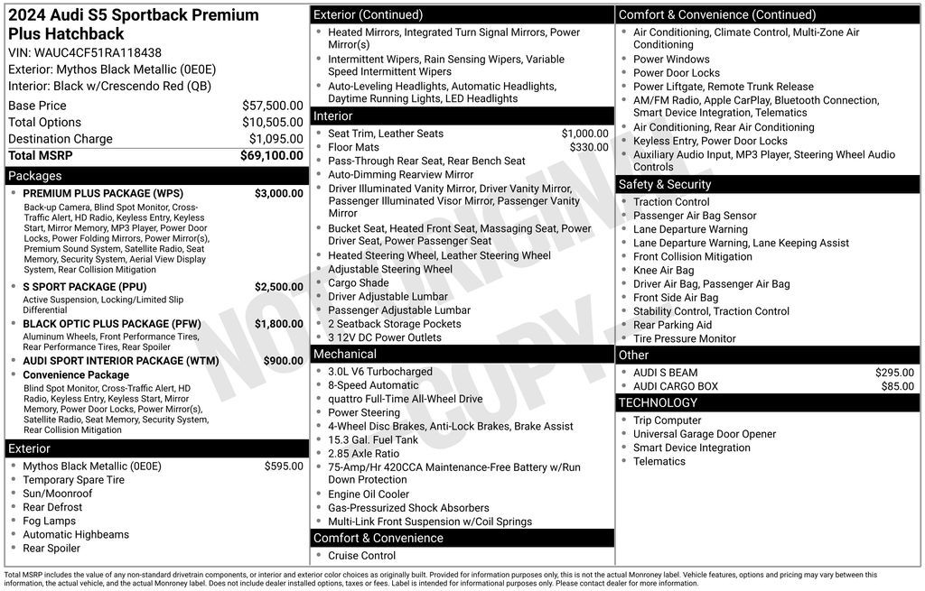 Black Metallic 2024 Audi S5 Sportback quattro 8-Speed Automatic with Tiptronic 3.0L TFSI 20/29 City/Highway MPG -Branded Title
