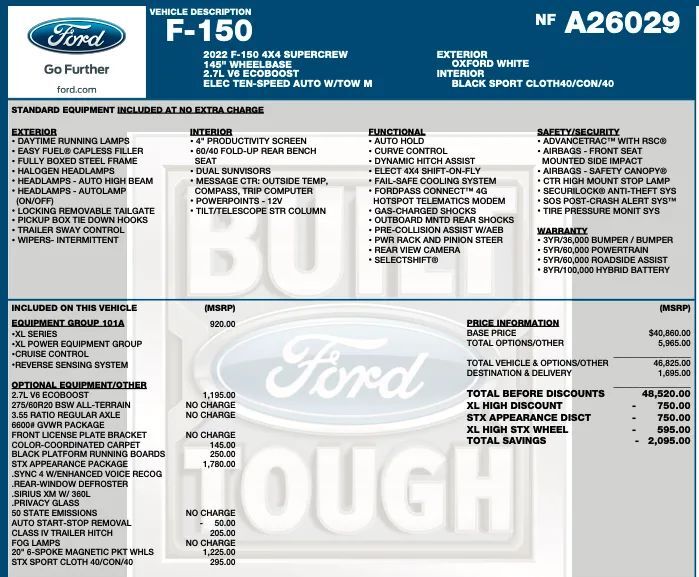 2.7L V6 ECOBOOSTSTX APPEARANCE PACKAGESYNC 4 W/ENHANCED VOICE RECOGREAR-WINDOW DEFROSTERSIRIUS XM W/ 360LPRIVACY GLASS20" 6-SPOKE MAGNETIC PKT WHLS 1,225.00STX SPORT CLOTH 40/CON/40XL SERIESXL POWER EQUIPMENT GROUPCRUISE CONTROLREVERSE SENSING SYSTEM