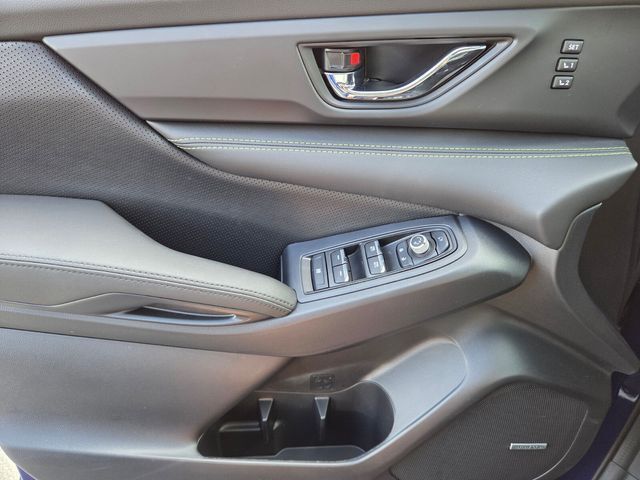 Exterior@Bumper detail (rear protector)~Exterior@Daytime running lights~Exterior@Door handle color (body-color)~Exterior@Exhaust (dual tip)~Exterior@Exhaust tip color (stainless steel)~Exterior@Exterior entry lights (approach lamps)~Exterior@Fender lip moldings (black)~Exterior@Front bumper color (black)~Exterior@Front fog lights (LED)~Exterior@Front wipers (rain sensing)~Exterior@Front wipers (speed sensitive)~Exterior@Front wipers (variable intermittent)~Exterior@Grille color (black)~Exterior@Headlight bezel color (black)~Exterior@Headlights (LED)~Exterior@Headlights (auto delay off)~Exterior@Headlights (auto high beam dimmer)~Exterior@Headlights (auto on/off)~Exterior@Headlights (cornering)~Exterior@Headlights (self-leveling)~Exterior@Headlights (wiper activated)~Exterior@Heated windshield wiper rests~Exterior@Liftgate window (fixed)~Exterior@Mirror color (black)~Exterior@Moonroof / Sunroof (anti-trapping)~Exterior@Moonroof / Sunroof (one-touch open/close)~Exterior@Moonroof / Sunroof (power panoramic)~Exterior@Moonroof / Sunroof (power sunshade)~Exterior@Moonroof / Sunroof (tilt/slide)~Exterior@Power windows (safety reverse)~Exterior@Rear bumper color (black accents)~Exterior@Rear bumper color (body-color)~Exterior@Rear privacy glass~Exterior@Rear spoiler (roofline)~Exterior@Rear spoiler color (black)~Exterior@Rear trunk/liftgate (liftgate)~Exterior@Rear trunk/liftgate (power operated)~Exterior@Rear wiper (auto-on in reverse)~Exterior@Rear wiper (intermittent)~Exterior@Rear wiper (with washer)~Exterior@Roof rails (black)~Exterior@Side mirror adjustments (power folding)~Exterior@Side mirror adjustments (power)~Exterior@Side mirror adjustments (reverse gear tilt)~Exterior@Side mirrors (heated)~Exterior@Side mirrors (integrated turn signals)~Exterior@Tinted glass~Exterior@Window defogger (rear)~Exterior@Window trim (black)~Interior@Adaptive cruise control~Interior@Adaptive stop and go cruise control (semi-automatic)~Interior@Air filtration~Interior@Airbag deactivation (occupant sensing passenger)~Interior@Ambient lighting~Interior@Antenna type (diversity)~Interior@Antenna type (element)~Interior@Antenna type (mast)~Interior@Armrests (rear outboard seats)~Interior@Assist handle (front)~Interior@Assist handle (rear)~Interior@Autonomous lane guidance (lane centering)~Interior@Auxiliary audio input (Bluetooth)~Interior@Auxiliary audio input (USB)~Interior@Auxiliary audio input (iPod/iPhone)~Interior@Auxiliary audio input (jack)~Interior@Cargo area floor mat (rubber/vinyl)~Interior@Cargo area light~Interior@Cargo cover (retractable)~Interior@Center console (front console with armrest and storage)~Interior@Center console (illuminated)~Interior@Center console (organizer tray)~Interior@Connected in-car apps (Google POIs)~Interior@Connected in-car apps (Google search)~Interior@Connected in-car apps (SiriusXM Travel Link)~Interior@Connected in-car apps (Yelp)~Interior@Conversation mirror~Interior@Courtesy lights (door)~Interior@Cupholders (front)~Interior@Cupholders (illuminated)~Interior@Cupholders (rear)~Interior@Cupholders (third row)~Interior@Digital sound processing~Interior@Door trim (leatherette)~Interior@Door trim (simulated carbon fiber)~Interior@Driver assistance app (roadside assistance)~Interior@Driver seat (heated)~Interior@Driver seat (ventilated)~Interior@Driver seat power adjustments (12)~Interior@Driver seat power adjustments (4-way power lumbar)~Interior@Driver seat power adjustments (height)~Interior@Driver seat power adjustments (reclining)~Interior@Easy entry (manual rear seat)~Interior@Easy entry (power driver seat)~Interior@Electronic messaging assistance (voice operated)~Interior@Electronic messaging assistance (with read function)~Interior@Floor mat material (carpet)~Interior@Floor material (carpet)~Interior@Floor mats (front)~Interior@Floor mats (rear)~Interior@Footwell lights~Interior@Front air conditioning (automatic climate control)~Interior@Front air conditioning zones (dual)~Interior@Front airbags (dual)~Interior@Front headrests (2)~Interior@Front headrests (adjustable)~Interior@Front seat type (bucket)~Interior@Hands-free phone call integration (voice operated)~Interior@Heated steering wheel~Interior@Infotainment (Subaru Infotainment System)~Interior@Infotainment screen size (11.6 in.)~Interior@Interior accents (chrome)~Interior@Interior accents (woodgrain)~Interior@Internet radio app (AHA)~Interior@Internet radio app (Pandora)~Interior@Internet radio app (iHeartRadio)~Interior@Knee airbags (driver)~Interior@Memorized settings (2 driver)~Interior@Memorized settings (driver seat)~Interior@Memorized settings (liftgate)~Interior@Memorized settings (side mirrors)~Interior@Multi-function remote (panic alarm)~Interior@Multi-function remote (proximity entry system)~Interior@Multi-function remote (trunk release)~Interior@Navigation app (TomTom)~Interior@Navigation data (real time traffic)~Interior@Navigation data (send destination to vehicle)~Interior@Navigation system (memory card)~Interior@Navigation system (over-the-air map updates (OTA))~Interior@Navigation system (touch screen display)~Interior@Navigation system (voice operated)~Interior@One-touch windows (2)~Interior@Overhead console (front)~Interior@Passenger seat (heated)~Interior@Passenger seat (ventilated)~Interior@Passenger seat power adjustments (4)~Interior@Passenger seat power adjustments (reclining)~Interior@Power outlet(s) (115V rear)~Interior@Power outlet(s) (12V cargo area)~Interior@Power outlet(s) (12V front)~Interior@Power outlet(s) (USB-C front)~Interior@Power outlet(s) (USB-C rear)~Interior@Power outlet(s) (two 12V front)~Interior@Power steering (variable/speed-proportional)~Interior@Power windows (lockout button)~Interior@Premium brand (harman/kardon)~Interior@Push-button start~Interior@Radio (AM/FM)~Interior@Radio (HD radio)~Interior@Radio (touch screen display)~Interior@Radio (voice operated)~Interior@Radio data system~Interior@Reading lights (front)~Interior@Reading lights (rear)~Interior@Reading l
