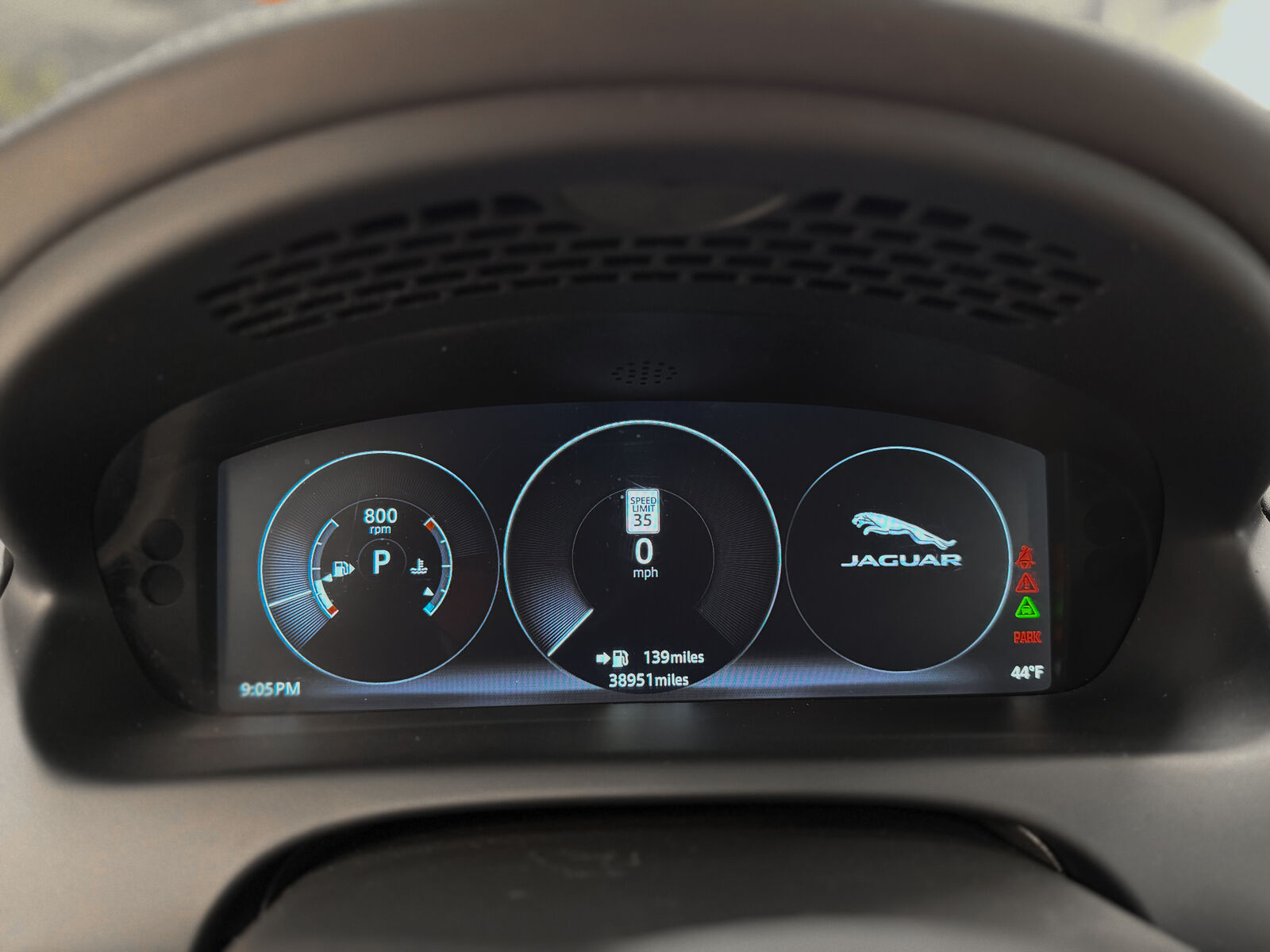 The leather-wrapped steering wheel frames an full digital gauge cluster with. The odometer indicates 38,951 miles.