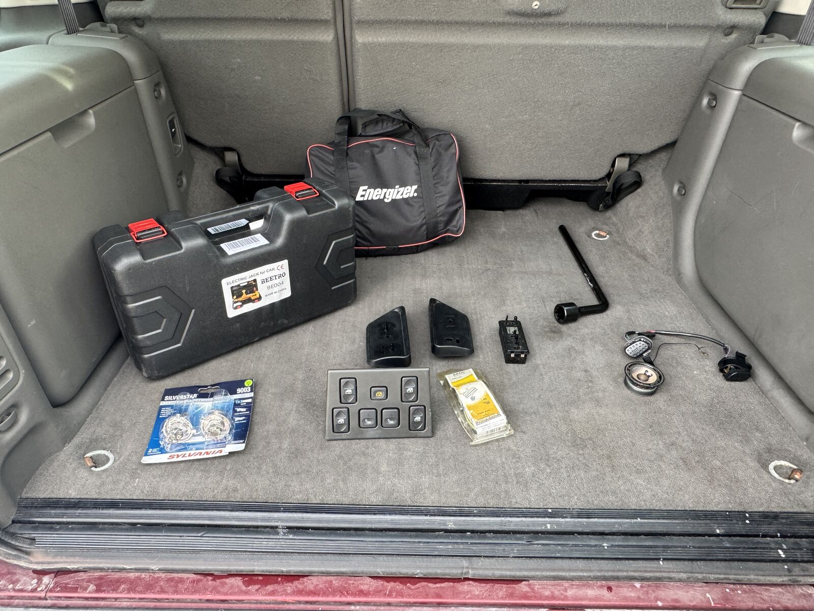 I'll include the 3 ton electric jack, battery jumper cables, lug wrench for the Land Rover lug nuts, and spare parts seen in the photo if you want them.