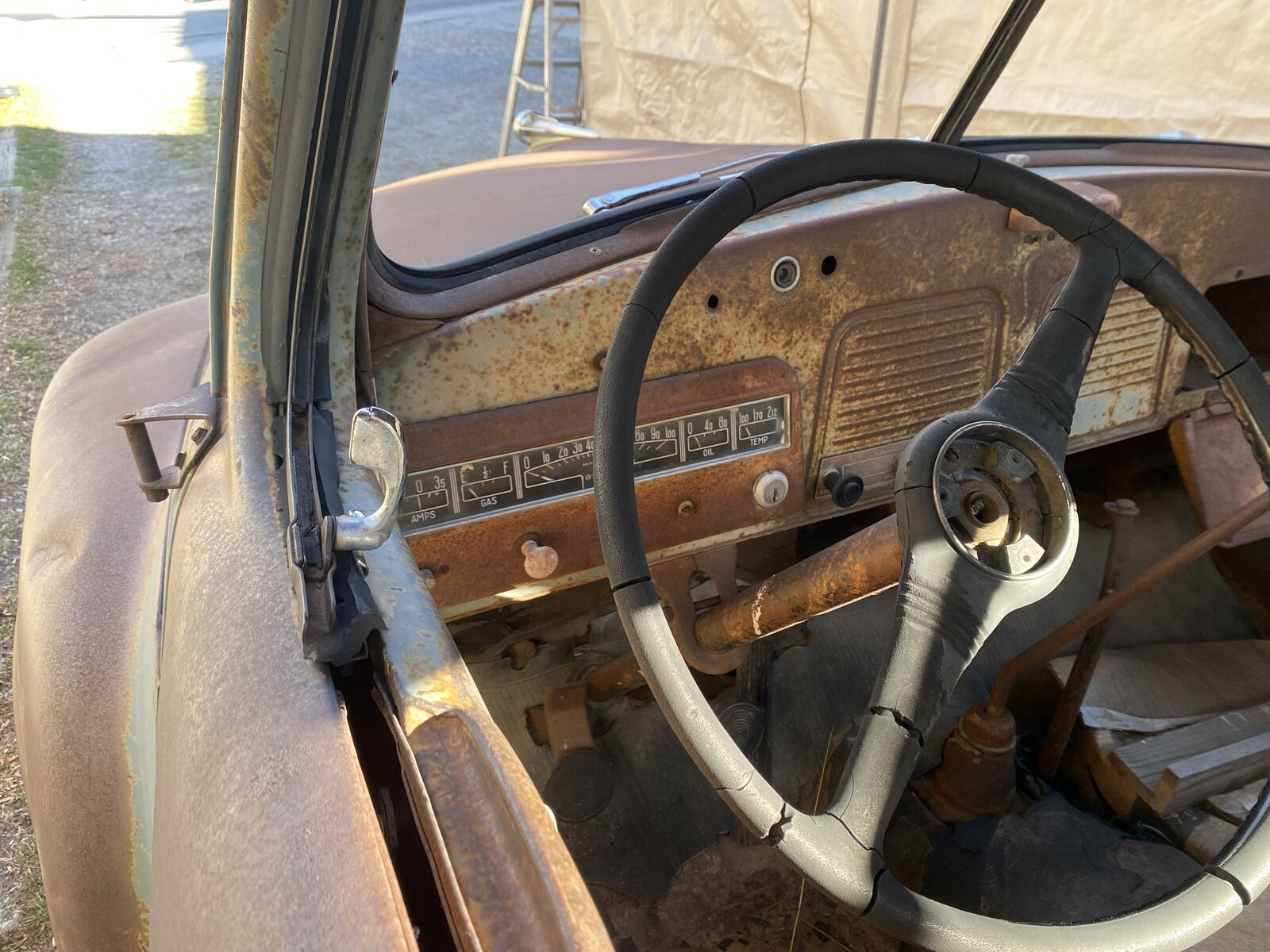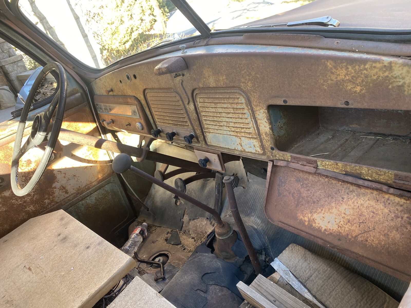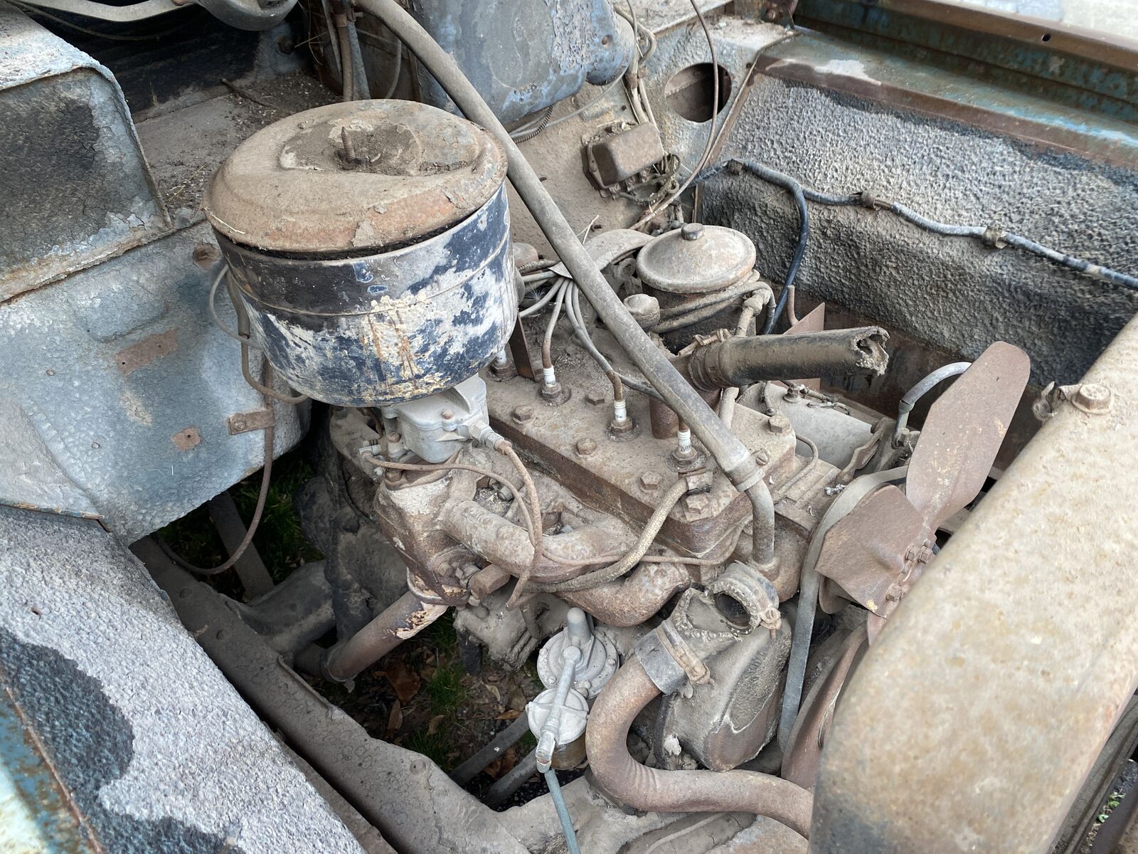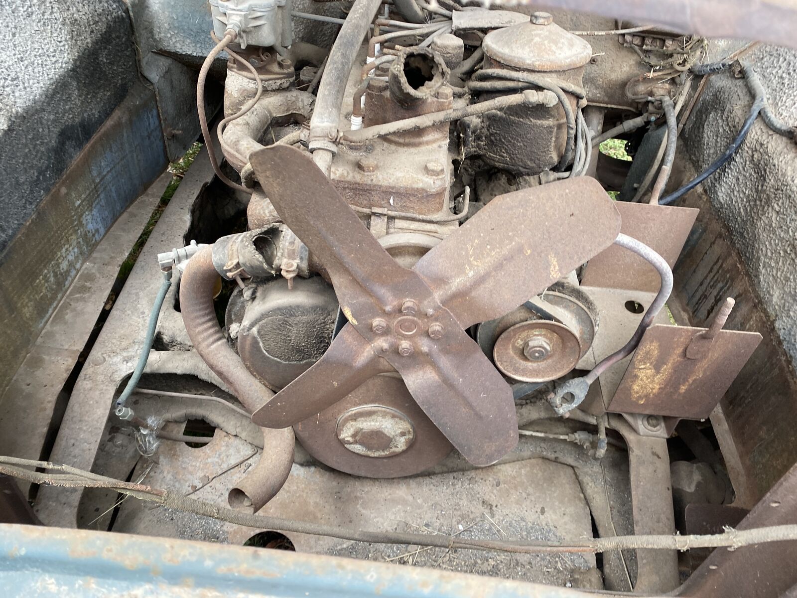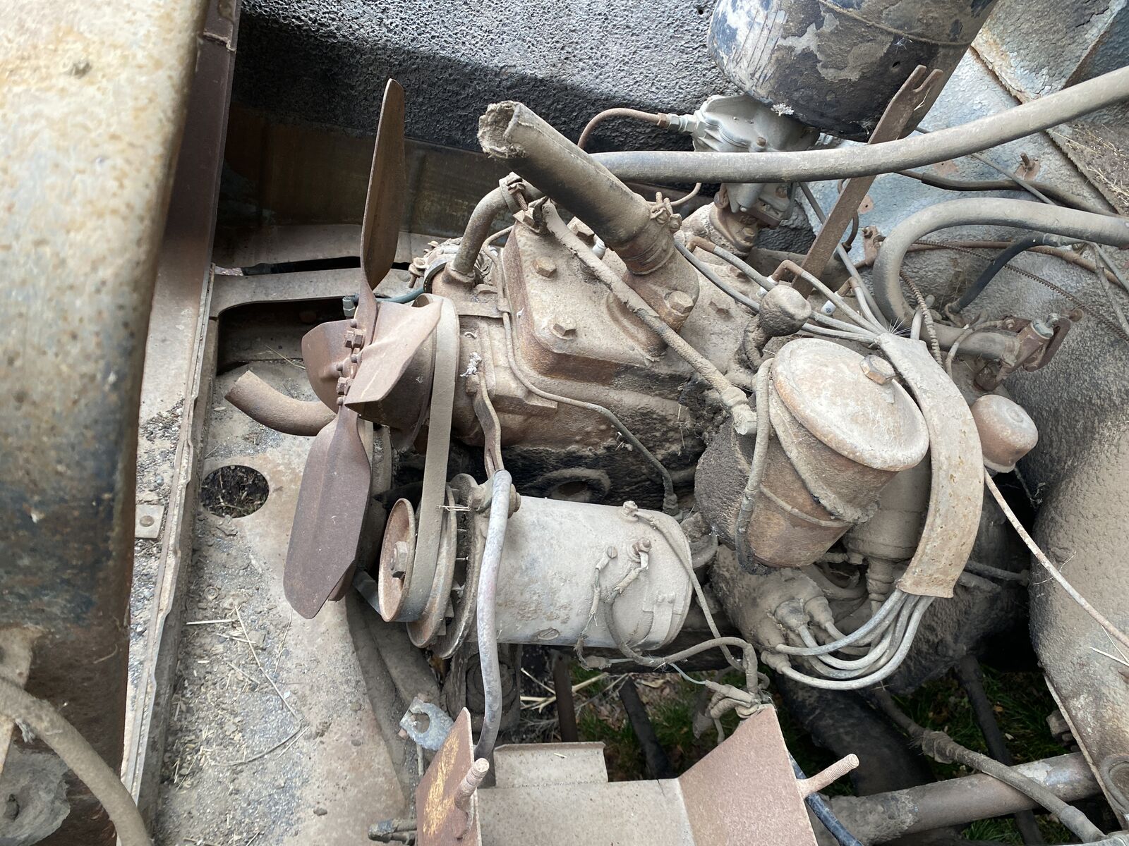 The 6 cyl flathead engine looks complete and original, even retaining the original air cleaner, etc.but the radiator is missing. I have not tried to turn it over.The interior is also rough. The seat springs are there but no upholstery.The instrument panel and dash look restorable, with most knobs still in place.All the glass is missing.