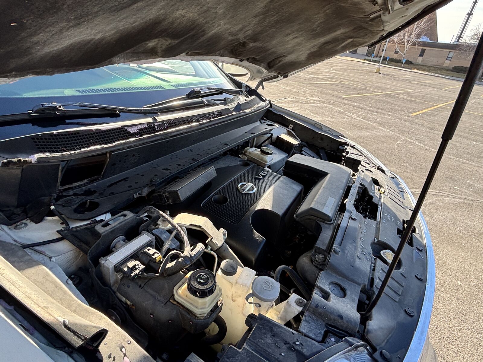 CVT transmission is slipping; it still runs and drives but will definitely need to be repaired. The check engine light is on for the catalytic converters (and maybe the transmission now). The body has several dents and dings but nothing major.