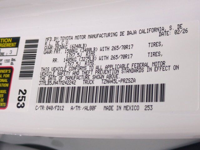 6K 87 8G 9K FE MF OU T6,TRD OFF ROAD UPGRADE PACKAGE -inc: HomeLink Universal Transceiver Integrated Trailer Brake Controller multi-information display (MID) screen and trailer brake type gain and manual trailer brake output controls Pre-Wire Accommodation (Bed Power Port) Deck Storage Box Heated Leather-Trimmed Steering Wheel Power Horizontal Rear Window 120V/400W AC Power Inverter Heated Front Seats Smart Key w/Digital Key Technology Digital key enables smartphone to be used instead of a physical key (Remote Connect subscription required) JBL Premium Audio 10 speakers w/JBL FLEX portable Bluetooth speaker subwoofer and amplifier Low Auxiliary (30A) Switches 8-Way Power Driver & Passenger Seat Adjusters,FRONT & REAR RECOVERY HOOKS,MUDGUARDS (TMS),MULTIMEDIA SCREEN PROTECTOR - GLASS (TMS),BLACK TAILGATE INSERT (TMS),SUSPENSION KIT W/2.5 LIFT (TMS),BED SCENE LIGHTING (TMS),Turbocharged,Four Wheel Drive,Locking/Limited Slip Differential,Tow Hitch,Power Steering,ABS,4-Wheel Disc Brakes,Brake Assist,Aluminum Wheels,Tires - Front All-Terrain,Tires - Rear All-Terrain,Conventional Spare Tire,Tow Hooks,Heated Mirrors,Power Mirror(s),Integrated Turn Signal Mirrors,Rear Defrost,Privacy Glass,Intermittent Wipers,Variable Speed Intermittent Wipers,Power Door Locks,Daytime Running Lights,Automatic Headlights,LED Headlights,Automatic Highbeams,Fog Lamps,AM/FM Stereo,Satellite Radio,MP3 Capability,HD Radio,Smart Device Integration,Requires Subscription,MP3 Capability,Steering Wheel Audio Controls,Auxiliary Audio Input,Bluetooth Connection,Bucket Seats,Driver Adjustable Lumbar,Pass-Through Rear Seat,Rear Bench Seat,Adjustable Steering Wheel,Trip Computer,Power Windows,WiFi Hotspot,Leather Steering Wheel,Keyless Entry,Power Door Locks,Keyless Start,Keyless Entry,Power Door Locks,Cruise Control,Adaptive Cruise Control,Climate Control,A/C,Cloth Seats,Auto-Dimming Rearview Mirror,Driver Vanity Mirror,Passenger Vanity Mirror,Driver Illuminated Vanity Mirror,Passenger Illuminated Visor Mirror,Floor Mats,Smart Device Integration,Requires Subscription,Smart Device Integration,Power Door Locks,Power Windows,Trip Computer,Immobilizer,Security System,Cruise Control Steering Assist,Traction Control,Stability Control,Traction Control,Front Side Air Bag,Telematics,Requires Subscription,Lane Departure Warning,Lane Keeping Assist,Lane Departure Warning,Front Collision Mitigation,Blind Spot Monitor,Cross-Traffic Alert,Tire Pressure Monitor,Driver Air Bag,Passenger Air Bag,Passenger Air Bag Sensor,Knee Air Bag,Front Head Air Bag,Rear Head Air Bag,Child Safety Locks,Back-Up Camera