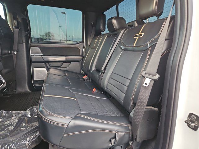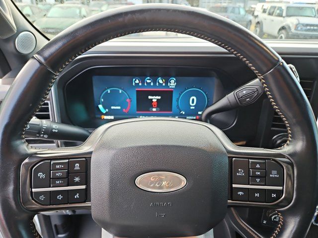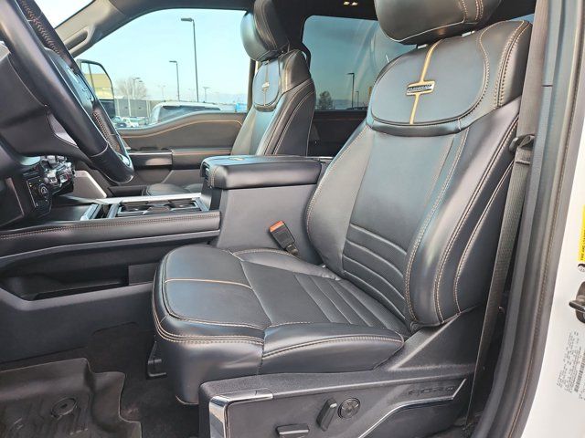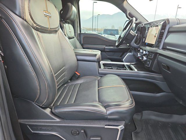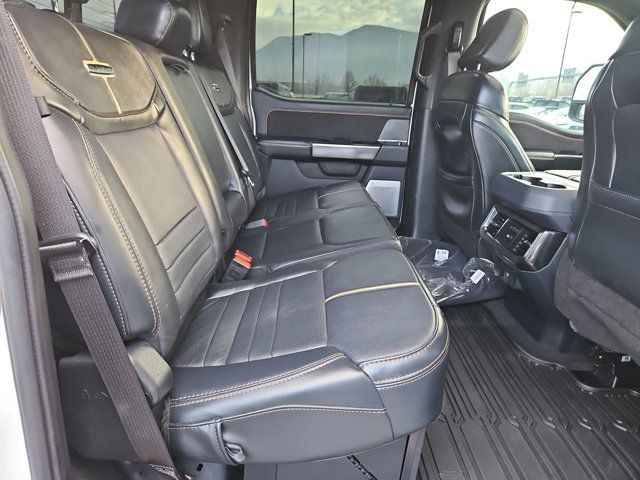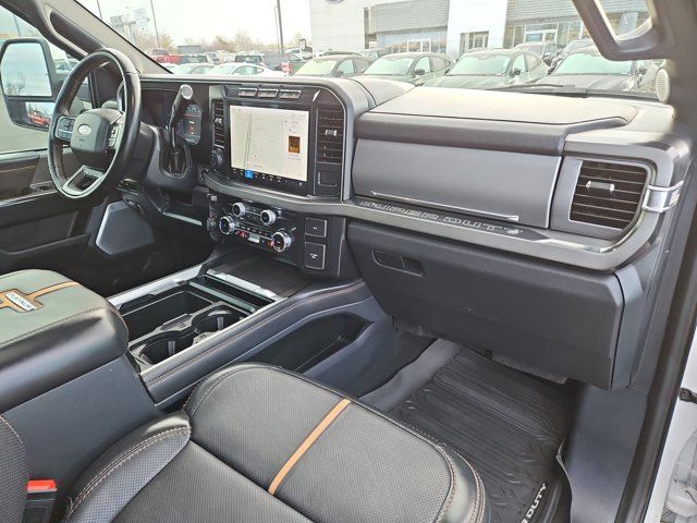 ENGINE: 6.7L HIGH OUTPUT POWER STROKE V8 DIESEL -inc: Turbo diesel B20 manual push-button engine-exhaust braking Operator Commanded Regeneration (OCR) and intelligent oil-life monitor 34 Gallon Fuel Tank GVWR: 12 000 lb Payload Package 3.31 Axle Ratio Dual 68 AH AGM 750 CCA Batteries,Locking/Limited Slip Differential,Four Wheel Drive,Tow Hitch,Power Steering,ABS,4-Wheel Disc Brakes,Brake Assist,Aluminum Wheels,Tires - Front All-Terrain,Tires - Rear All-Terrain,Conventional Spare Tire,Tow Hooks,Heated Mirrors,Power Mirror(s),Integrated Turn Signal Mirrors,Power Folding Mirrors,Rear Defrost,Privacy Glass,Intermittent Wipers,Variable Speed Intermittent Wipers,Rain Sensing Wipers,Running Boards/Side Steps,Power Retractable Running Boards,Integrated Tailgate Step,Fog Lamps,Automatic Highbeams,Daytime Running Lights,Automatic Headlights,LED Headlights,AM/FM Stereo,Premium Sound System,Steering Wheel Audio Controls,Auxiliary Audio Input,Passenger Adjustable Lumbar,Pass-Through Rear Seat,Rear Bench Seat,Adjustable Steering Wheel,WiFi Hotspot,Leather Steering Wheel,Heated Steering Wheel,Universal Garage Door Opener,Cruise Control,Adaptive Cruise Control,Climate Control,Multi-Zone A/C,A/C,Power Driver Seat,Power Passenger Seat,Leather Seats,Bucket Seats,Heated Front Seat(s),Cooled Front Seat(s),Seat-Massage,Auto-Dimming Rearview Mirror,Driver Vanity Mirror,Passenger Vanity Mirror,Driver Illuminated Vanity Mirror,Passenger Illuminated Visor Mirror,Floor Mats,Adjustable Pedals,Heads-Up Display,Immobilizer,Security System,Cruise Control Steering Assist,Stability Control,Front Side Air Bag,Front Collision Mitigation,Blind Spot Monitor,Cross-Traffic Alert,Rear Collision Mitigation,Aerial View Display System,Rear Parking Aid,Lane Keeping Assist,Front Collision Warning,Driver Monitoring,Tire Pressure Monitor,Front Head Air Bag,Rear Head Air Bag,Driver Air Bag,Passenger Air Bag,Child Safety Locks,Back-Up Camera