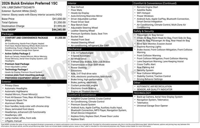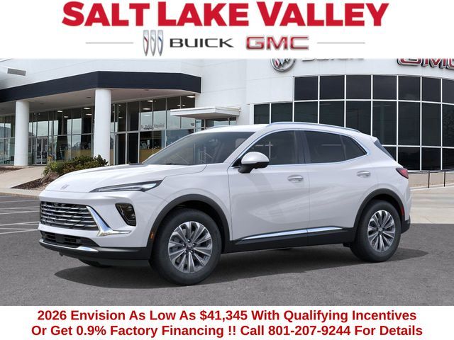 2026 Buick Envision Preferred 4D Sport Utility Summit White 2.0L Turbocharged AWD 22/28 City/Highway MPG --- Please note that the final selling price does not include tax, tag, title, documentation fees, dealer-installed options, or pricing adjustments due to market demand. Financing through GM Financial is required for all discounts to be applied. Special finance offers may not be combined with some factory incentives. While we strive for accuracy, errors may occur, so please verify all information with a customer service representative. For the most accurate pricing, call us at (801) 265-1511 or visit our dealership in person. Prices and payments are subject to change based on manufacturer incentives. ... Sale Price may include dealer discount, $500 - Buick GMC Bonus Cash - Price includes $1,000 Down Payment Assistance. Must Finance with GM Financial – Price includes $1,500 Trade-In Allowance for customers trading a 2019 or newer passenger car or truck with under 80,000 miles toward a new 2025–2026 Buick or GMC. Branded or salvage title vehicles do not qualify. Some restrictions apply. See dealer for details.