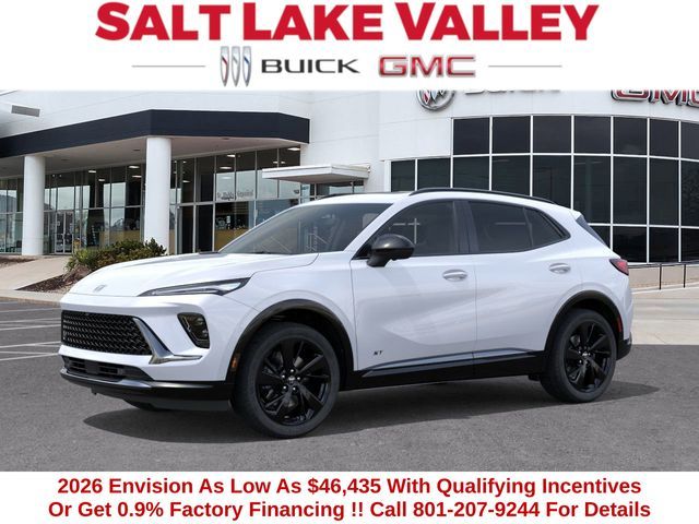 2026 Buick Envision Sport Touring 4D Sport Utility Iridescent White Tricoat 2.0L Turbocharged AWD 22/28 City/Highway MPG --- Please note that the final selling price does not include tax, tag, title, documentation fees, dealer-installed options, or pricing adjustments due to market demand. Financing through GM Financial is required for all discounts to be applied. Special finance offers may not be combined with some factory incentives. While we strive for accuracy, errors may occur, so please verify all information with a customer service representative. For the most accurate pricing, call us at (801) 265-1511 or visit our dealership in person. Prices and payments are subject to change based on manufacturer incentives. ... Sale Price may include dealer discount, $500 - Buick GMC Bonus Cash - Price includes $1,000 Down Payment Assistance. Must Finance with GM Financial – Price includes $1,500 Trade-In Allowance for customers trading a 2019 or newer passenger car or truck with under 80,000 miles toward a new 2025–2026 Buick or GMC. Branded or salvage title vehicles do not qualify. Some restrictions apply. See dealer for details.