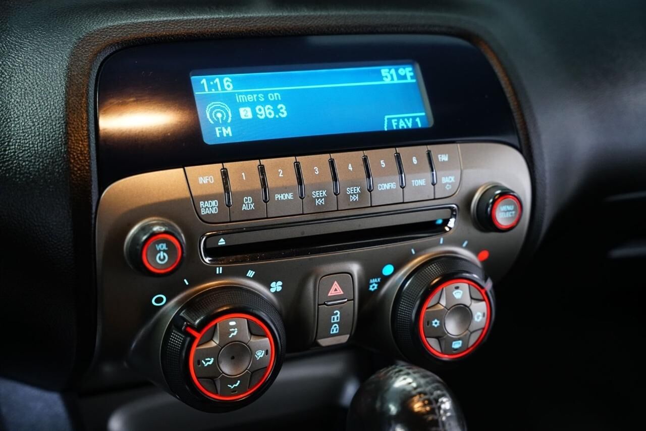 Engine- 3.6L Variable Valve Timing V6 with SIDI (Spark Ignition Direct Injection) (312 hp [232.6 kW] @ 6500 rpm- 278 lb-ft of torque [375.3 N-m] @ 5100 rpm),Axle- 3.27 ratio,Rear wheel drive,Alternator- 150 amps,Battery- maintenance-free with rundown protection and retained accessory power,Suspension- Sport,Steering- power- variable ratio,Brakes- 4-wheel antilock- 4-wheel disc (Single piston front brakes with super corner rear brakes.),Exhaust- dual-outlet stainless-steel with polished tips,Tire sealant and inflator kit in place of spare tire,Molding- Black roof ditch,Fascias- front and rear body-color with front grille and rear diffuser,Moldings- body-color lower rocker,Hood blanket with debossed Chevrolet bowtie,Fog lamps (When (WRS) RS Package is ordered- fog lamps act as Daytime Running Lamps.),Mirrors- outside power-adjustable body-color,Wipers- front intermittent,Door handles- body-color,Audio system feature 6-speaker system,Antenna- integral rear window,Antenna- OnStar and XM Radio fin-type (Located on roof.),Seat adjuster- driver- 6-way power (fore/aft- up/down- tilt) with power recliner,Seat adjuster- front passenger 2-way manual (fore/aft) with power recliner,Console- floor- with armrest,Dead pedal- driver,Steering wheel- 3-spoke- urethane,Steering column- manual rake and telescopic,Instrumentation- analog with Driver Information Center display- includes speedometer- tachometer- fuel gauge and engine temperature gauge,Compass- located in Driver Information Center,Windows- power with driver and passenger Express-Down/Up,Cruise control- electronic with set and resume speed- steering wheel mounted,Trunk release- remote- located on driver-side,Theft-deterrent system- PASS-Key III,Air conditioning- single-zone manual,Air filtration system with pollen filter,Defogger- rear-window- electric,Glovebox- lockable,Power outlets- 2 auxiliary 1 located in center console storage area and 1 located at front of center console,Cup holders- 2 front,Map pockets- front doors,Mirror- inside rearview manual day/night,Visors- driver and front passenger vanity mirrors- covered,Lighting- front reading lamps,Lighting- interior dome with illuminated entry and theater dimming,Coat hooks- driver- and passenger-side rear,Shift knob- urethane,StabiliTrak- stability control system with traction control,Daytime Running Lamps,Air bags- dual-stage frontal- and thorax side-impact- driver and front passenger- and head curtain side-impact- front and rear outboard seating positions includes Passenger Sensing System (Head curtain side air bags are designed to help reduce the risk of head and neck injuries to front and rear seat outboard occupants on the near side of certain side-impact collisions. Always use safety belts and the correct child restraints for your child's age and size. Even in vehicles equipped with air bags and the Passenger Sensing System- children are safer when properly secured in a rear seat in the appropriate infant- child or booster seat. Never place a rear-facing infant restraint in the front seat of any vehicle equipped with an active frontal air bag. See the Owner's Manual and child safety seat instructions for more safety information.),Safety belts- 3-point- all seating positions,Safety belt pretensioners driver and front passenger,LATCH system (Lower Anchors and Top tethers for CHildren) for child safety seats,Trunk emergency release handle