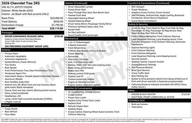 Discover the new Chevrolet Trax at Salt Lake Valley Chevrolet in Salt Lake City! With bold design, modern technology, and reliable performance, Chevrolet makes every drive exciting. Whether it’s city streets or canyon roads, the Trax is ready for anything. Call us today at 801-969-8221 to schedule a time to see it! --- 2026 Chevrolet Trax White Sands ECOTEC 1.2L Turbo --- Final price excludes tax, tag, title, documentation fees, dealer-installed options, and any market-based pricing adjustments. Financing through GM Financial is required for all discounts to apply. Special finance offers may not be combined with certain factory incentives. While we strive for accuracy, errors may occur—please verify all information with a sales representative. For the most accurate pricing, call (801) 969-8221 or visit us in person. Prices and payments are subject to change based on manufacturer incentives. - Price includes - $500 - Chevrolet Consumer Cash Program - Price includes $1,500 Trade-In Allowance for customers trading a 2019 or newer passenger car or truck with under 80,000 miles toward a new 2025–2026 Chevrolet. Branded or salvage title vehicles do not qualify. Some restrictions apply. See dealer for details.