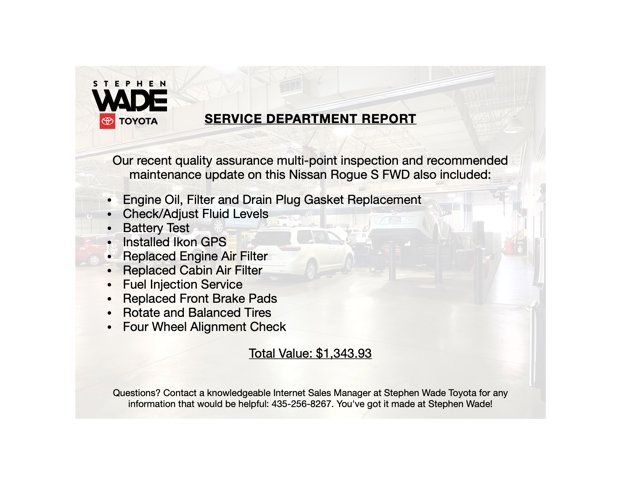 ONE OWNER CLEAN CARFAX. 2024 Nissan Rogue S FWD in Super Black with Charcoal Cloth. 1.5L DOHC 12-Valve Turbocharged Engine, Xtronic CVT, Front Wheel Drive.30/37 City/Highway MPG.CALL STEPHEN WADE TOYOTA: 435-241-3828.Floor Mats, Cargo Area Protector, Seatback Protector, First Aid Kit.SERVICE REPORT: At Stephen Wade Toyota, we do more to insure we offer the most mechanically sound pre-owned vehicles with maintenance that is up to date. Our recent quality assurance multi-point inspection and recommended maintenance update on this Nissan Rogue also included an engine oil, filter and drain plug gasket replacement, check/adjust fluid levels, battery test, installed Ikon GPS, replaced engine air filter, replaced cabin air filter, fuel injection service, replaced front brake pads, rotate and balanced tires and a four wheel alignment check - a $1,343.93 value.MARKET REPORT: We use advanced software to shop the automotive marketplace nationwide everyday. This allows us to competitively offer you the best value one can find anywhere. Contact our knowledgeable Internet sales managers; Danny, Jessica or Wesley at Stephen Wade Toyota for a priority test drive, or for any information that would be helpful: 435-241-3828. You've got it made at Stephen Wade!