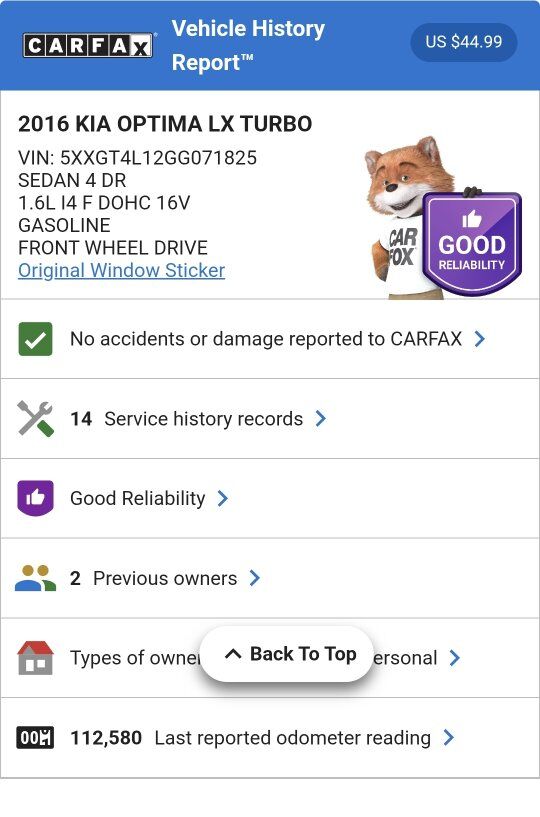 Very clean Kia Optima with the fun and reliable 1.6 turbo engine! Sounds, feels and looks great! Fantastic carfax that shows this car has been highly taken care of! Come check it out!