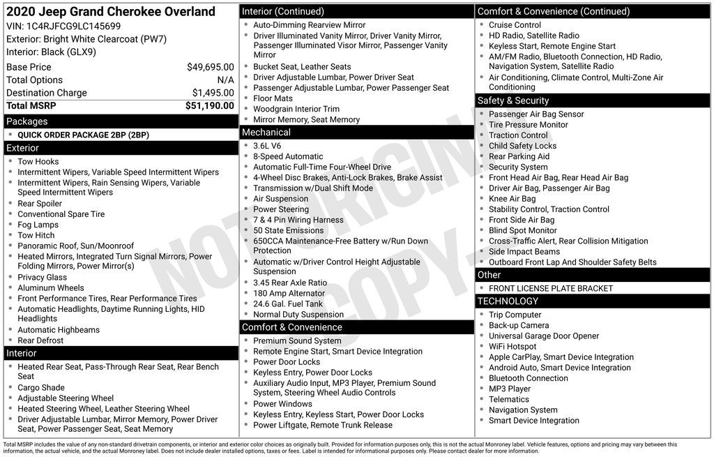 Bright White Clearcoat 2020 Jeep Grand Cherokee Overland 4WD 8-Speed Automatic 3.6L V6 24V VVT 4WD.